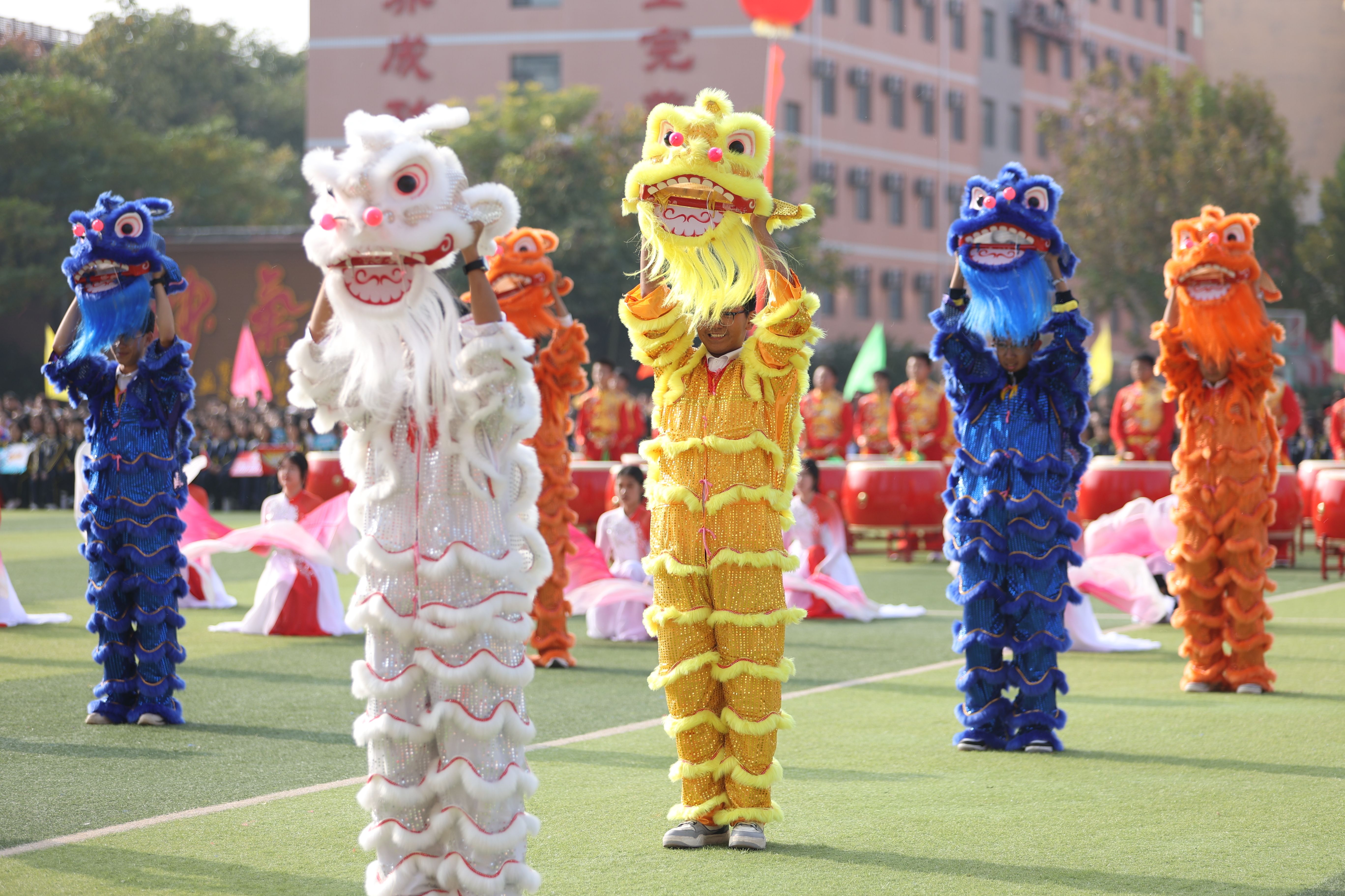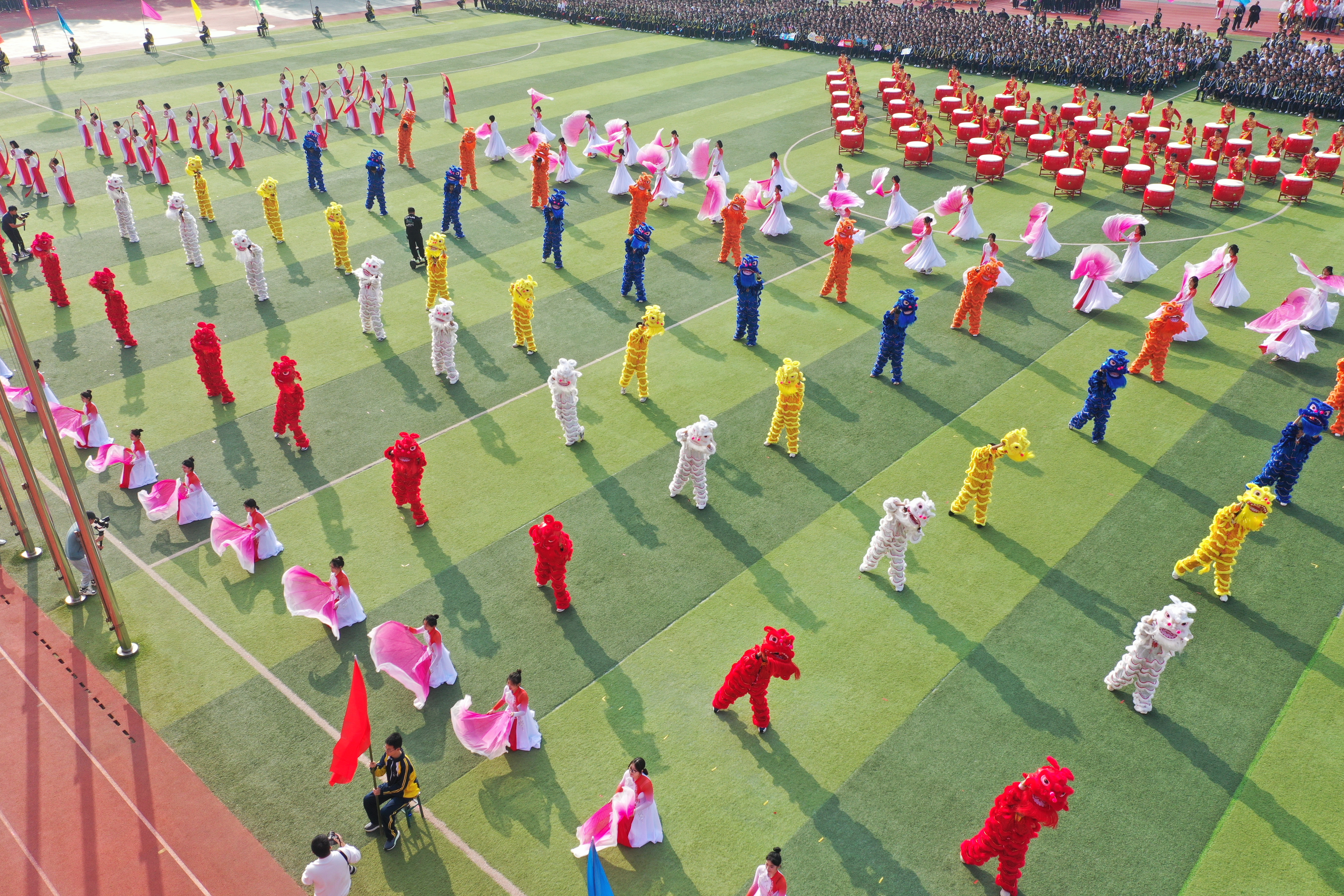 28日下午14时30分,运动会开幕式在大型团体操表演《盛世欢歌》中拉开序幕。“咚咚咚、咚咚咚……”45面大鼓整齐而有层次地排列在操场上,鼓手们众臂齐挥,擂出了“二中人”激昂奋发的精神。120名同学和着动听的音乐,跳着优美的舞蹈,带大家一起进入了美丽的舞蹈世界,展示出了新时代“二中人”的独特魅力和风貌。50名同学精彩而又喜庆的舞狮表演,更是迅速点燃了现场氛围,赢得了阵阵掌声。整场演出把现场师生带入了热烈喜庆、奋发昂扬的氛围中。