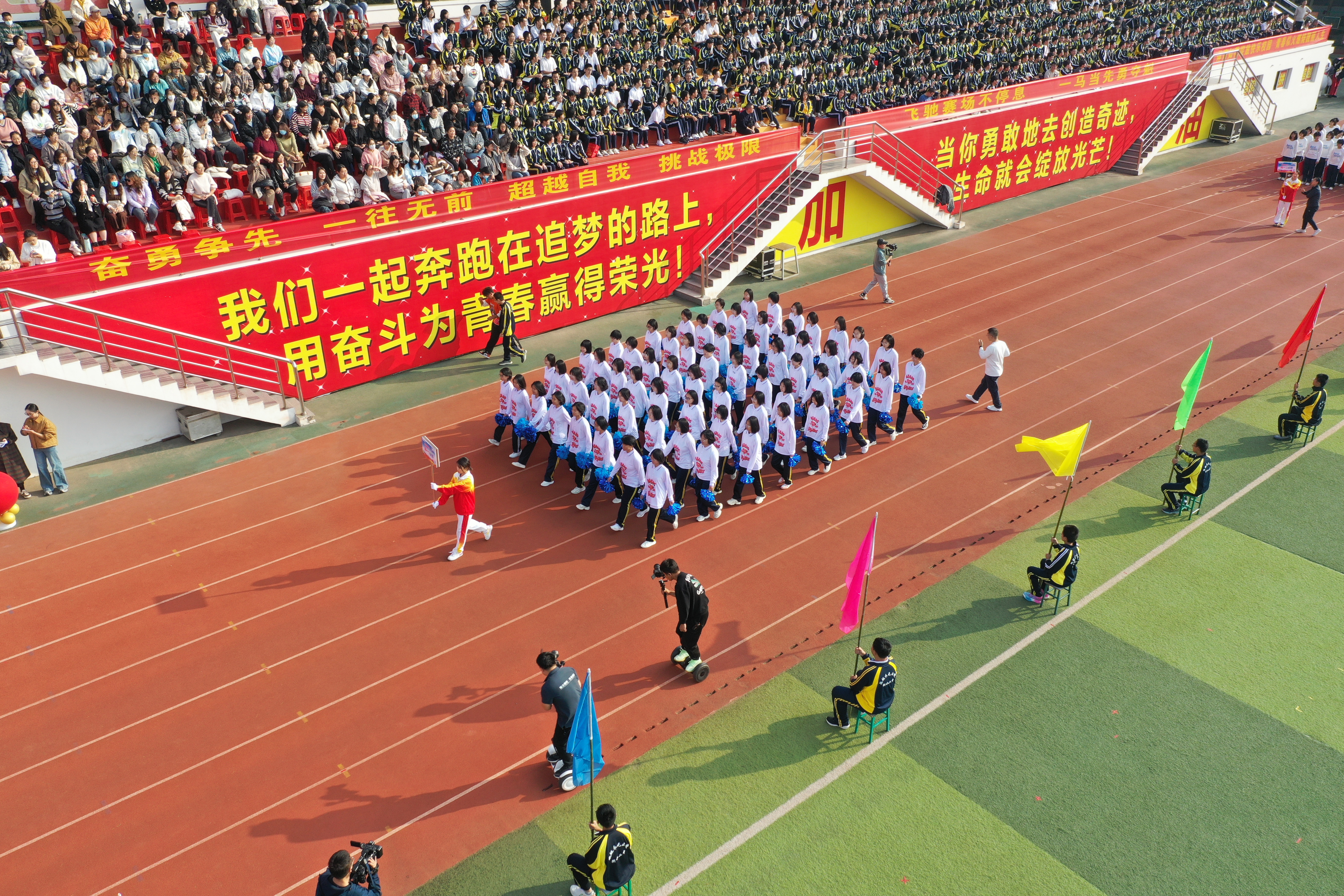 接下来,各代表队有序入场。国旗方队神情庄严,以满腔赤诚护卫着国旗正步前行,率先入场。校徽方队、会徽方队紧随其后,他们高举校徽、会徽,步伐铿锵,意气风发。接着是运动会的公平使者和中坚力量——裁判员方队和运动员方队依次入场。最后,各班风采展示方队迈着矫健的步伐、踏着奋进的节拍闪亮登场,他们或跳舞或唱歌,充分展示各自的才艺。方队里每个人的眼中都闪烁着对体育的热忱,脸上都洋溢着自信与活力,浑身透露出对胜利的坚定信念和不懈追求,充分展现了“二中人”良好的精神风貌和斗志雄心。全体参赛人员入场后,举行了庄严的升国旗仪式。在师生们的注目下,国旗队队员昂首阔步、动作整齐划一向前行进。伴随着雄壮的国歌,鲜艳的五星红旗冉冉升起、迎风飘扬,整个升旗仪式气氛庄重而热烈。