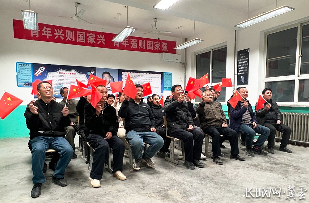 在蔡旭哲的母校,蔡张村的党员干部们聚集在教室,观看直播。随着飞船发射的画面播出,全场响起了热烈的掌声。大家挥舞着国旗,为蔡旭哲加油。当年从这里走出去的大男孩,已成为全校学生的偶像。