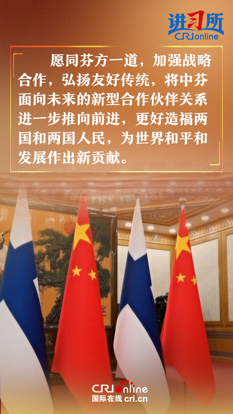 习近平指出,建交以来,中芬始终友好相处、互尊互信,树立了国与国之间超越历史、文化、制度差异,平等交往的典范。中方愿同芬方一道,加强战略合作,弘扬友好传统,将中芬面向未来的新型合作伙伴关系进一步推向前进,更好造福两国和两国人民,为世界和平和发展作出新贡献。
