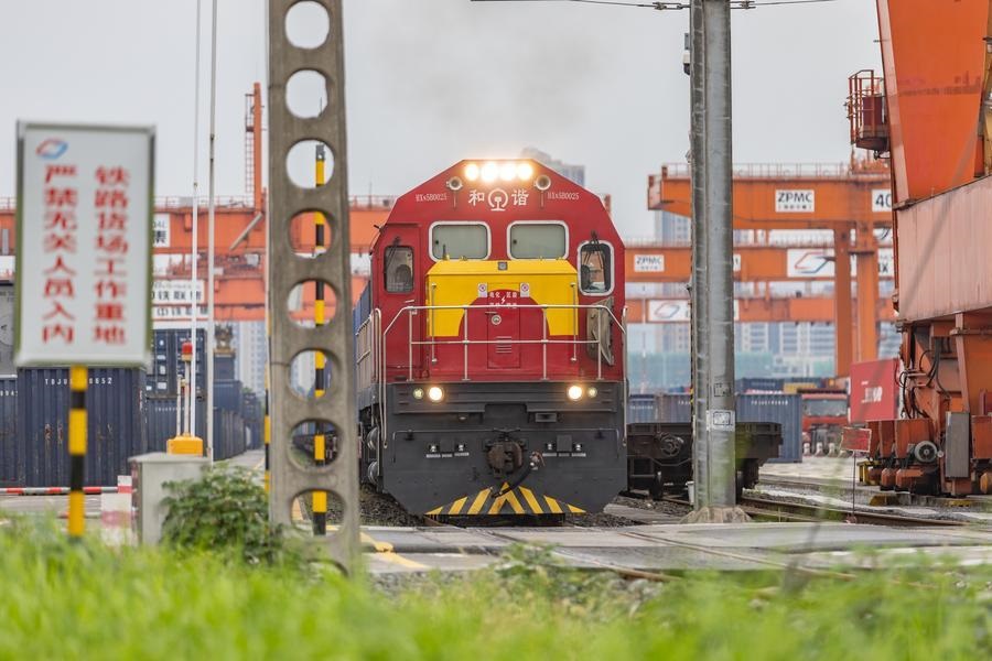 2024年7月30日,在重庆国际物流枢纽园区,一列装载机械设备、汽车和笔记本电脑的中欧班列从重庆团结村中心站驶出。新华社记者 黄伟 摄