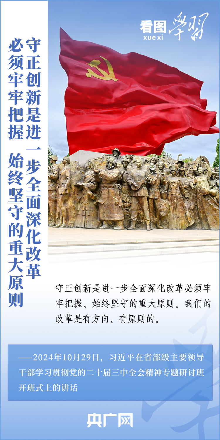 改革只有进行时,没有完成时。10月29日,省部级主要领导干部学习贯彻党的二十届三中全会精神专题研讨班在中央党校(国家行政学院)开班。习近平总书记发表重要讲话,就进一步全面深化改革的一系列重大问题进行深刻阐释,强调要牢牢把握、始终坚守“守正创新”这一重大原则,把握好“四对关系”,奋力打开改革发展新天地。一起来学习!