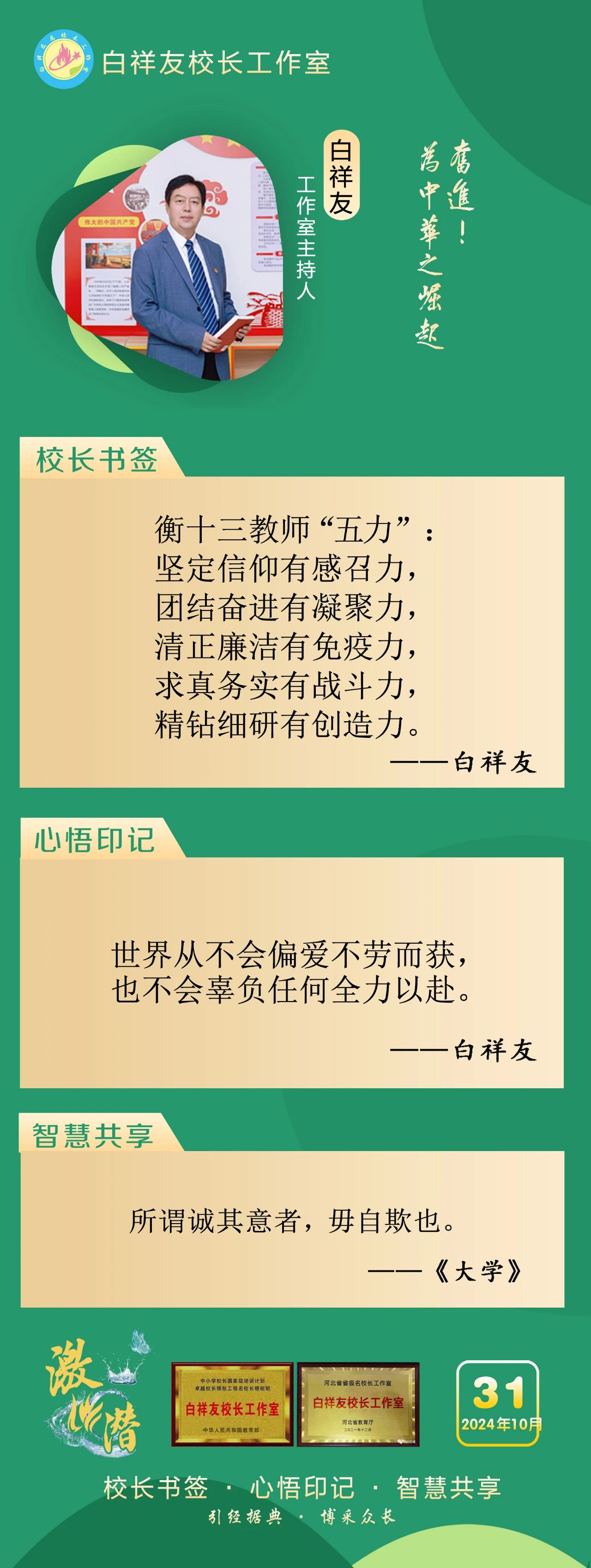 “白祥友校长工作室”成立于2019年4月,是教育部“国培计划”中小学名校长领航工程、河北省首批名校长工作室,目前省内外成员校37个。工作室坚持“资源共享、智慧共融、互助共赢”理念,已成为思想碰撞的交流场,资源共享的品牌站,成果展示的辐射源。