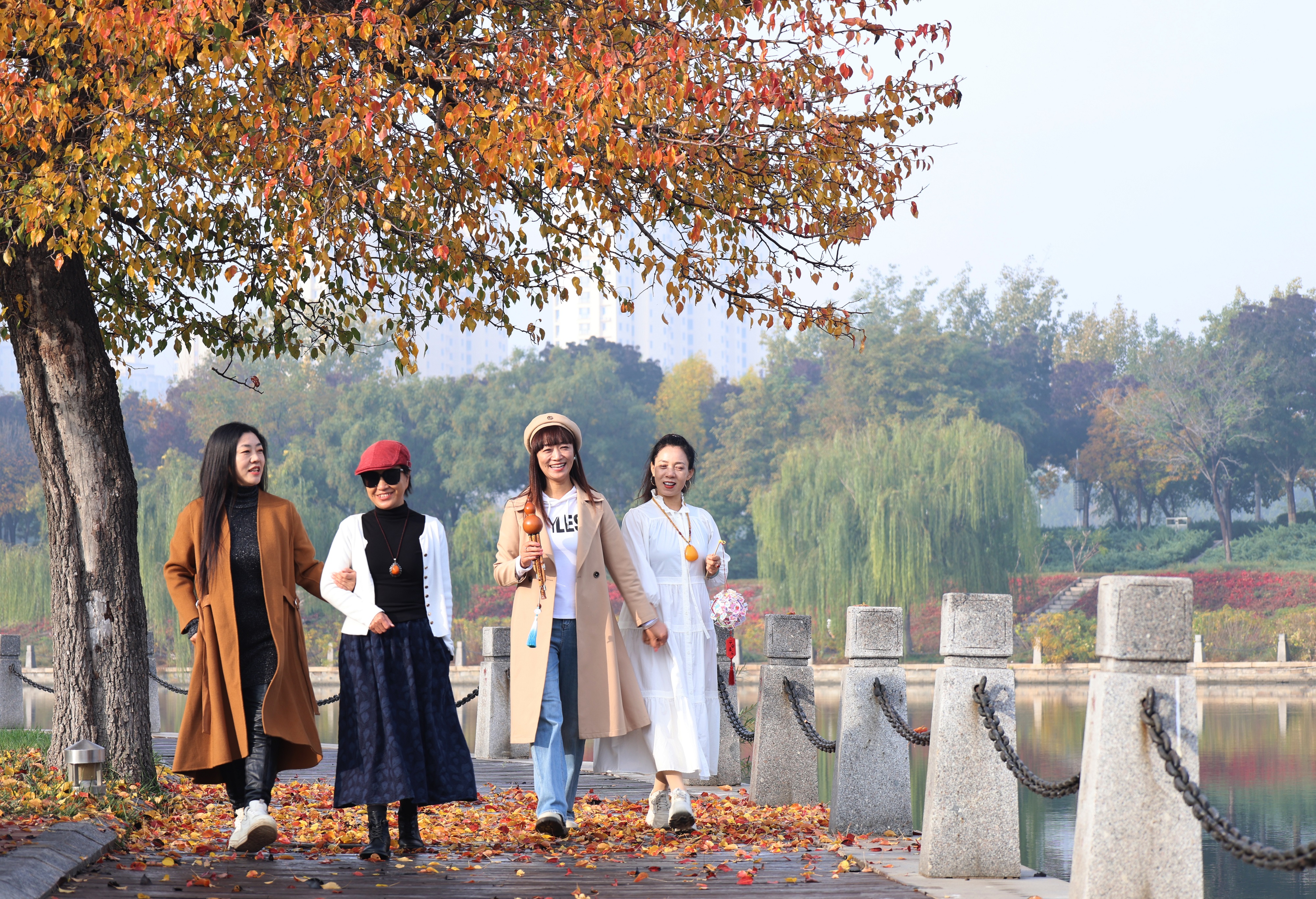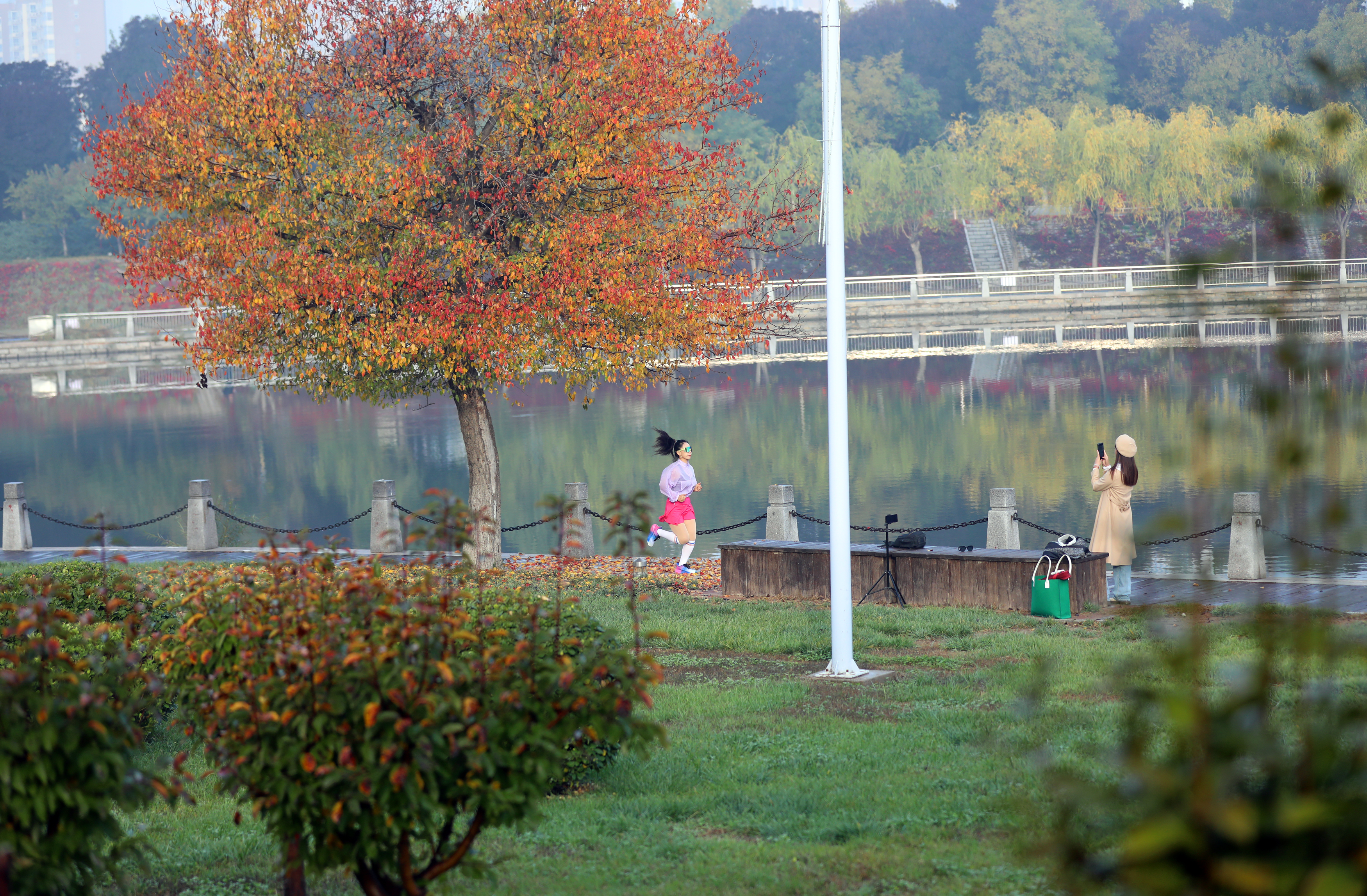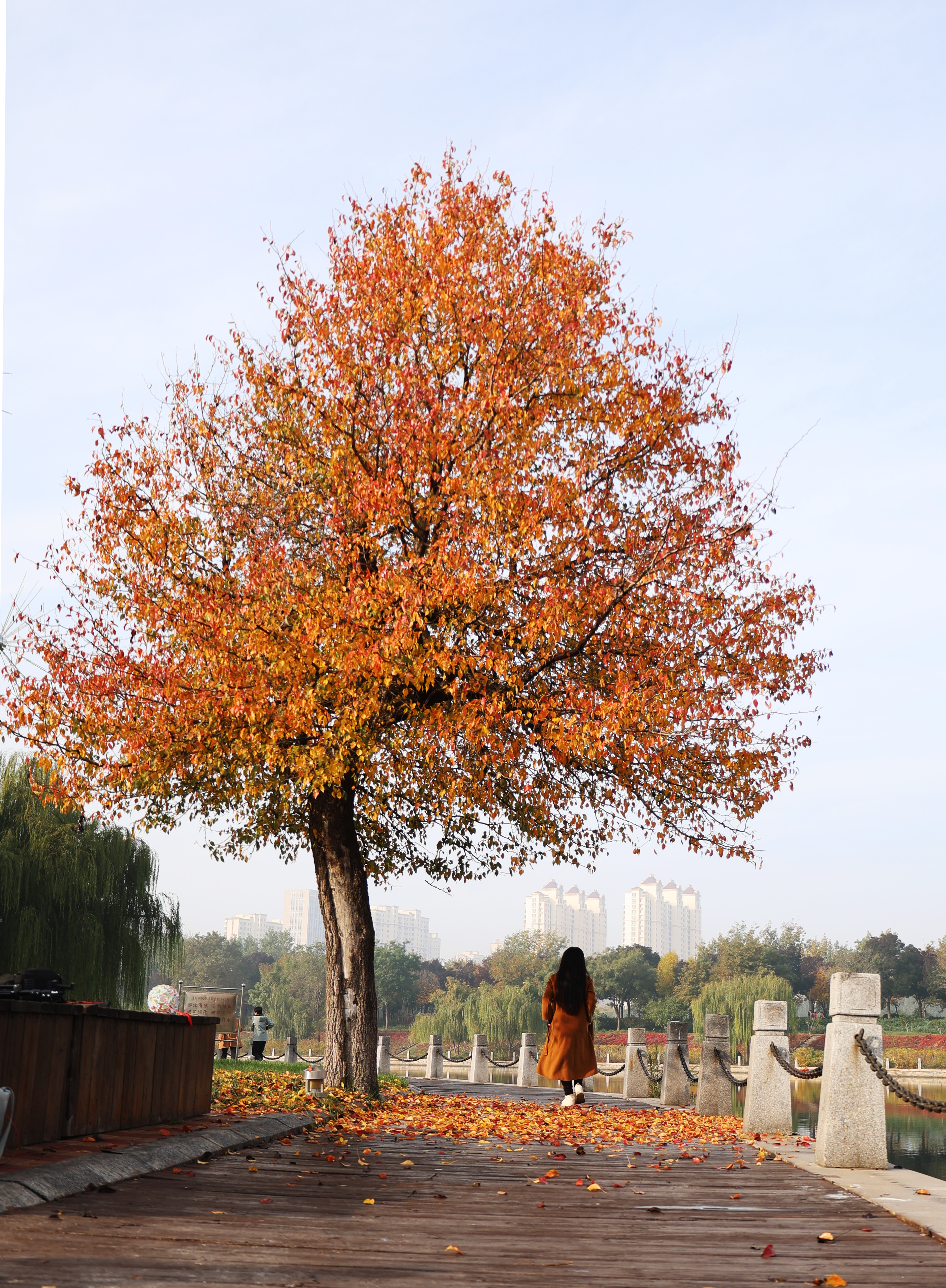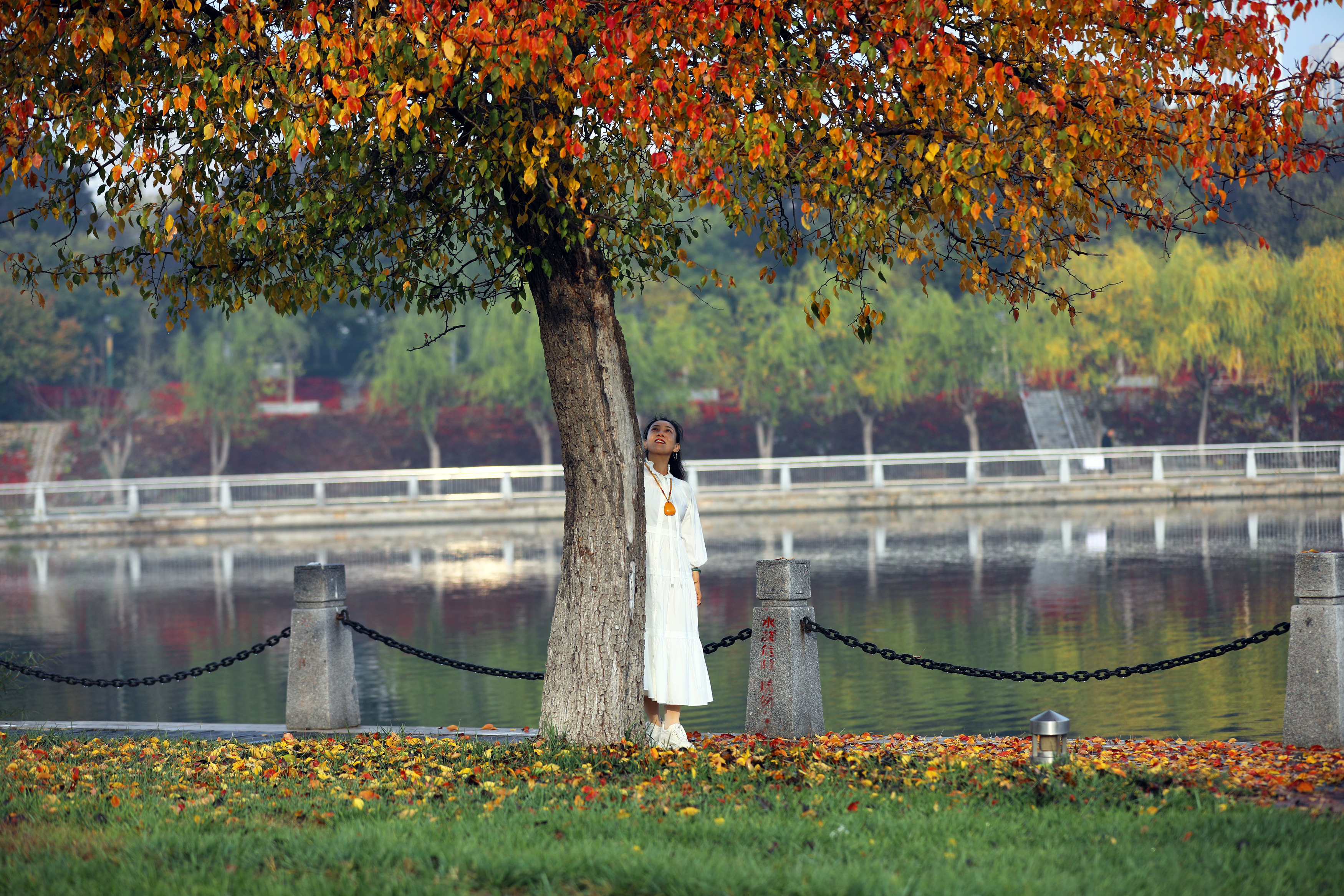 如今,记者在萧何文化广场对面目睹了它的风采。它依旧独自矗立在距离河边仅几米之遥的地方,树上红黄相间的叶子交相辉映,美不胜收。那红色的叶子恰似燃烧的熊熊火焰,热烈而奔放,洋溢着生命的激情;黄色的叶子仿若闪耀的璀璨金箔,明亮而夺目,散发着迷人的光辉。它们相互交织在一起,在微风的轻拂下轻轻摇曳,仿佛在低声诉说着这个季节的动人故事。