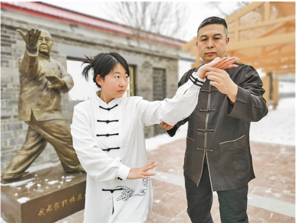 在固安县张村武术小镇武术广场,国家级非遗郭氏八卦掌第三代传承人郭浩认真指导学员们练习八卦掌。