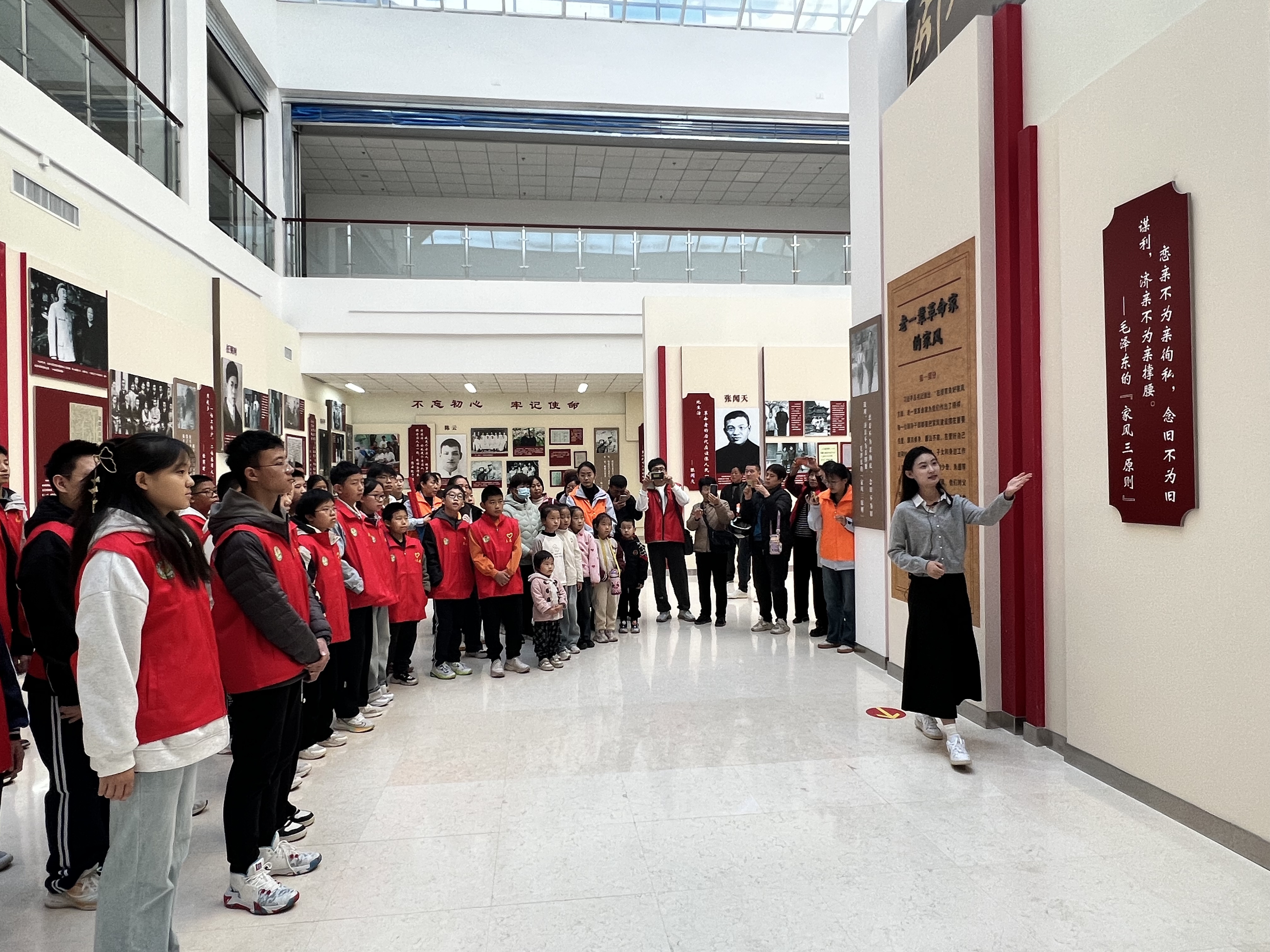 9时,同学们在讲解员的引导下,开始认真阅览展馆中一份份珍贵的档案文献,一幅幅历史图片、一件件文稿和大量历史资料向同学们展示着不同历史时期共产党人特别是老一辈革命家感人的家风故事。“家风是一个家庭世代相传的风尚和作风,老一辈革命家以德传家、以学兴家、以俭持家、以严治家、以廉守家,并对青少年殷殷嘱托‘小孩子要用心读书,现在不学将来没用’。”讲解员用心细致地讲解着,孩子们紧紧跟随,静静聆听。图文加讲解的形式,生动又全面,深深吸引着每一位学生。革命先辈们注重家风建设、涵养浩然正气的事迹感染着每一位同学。