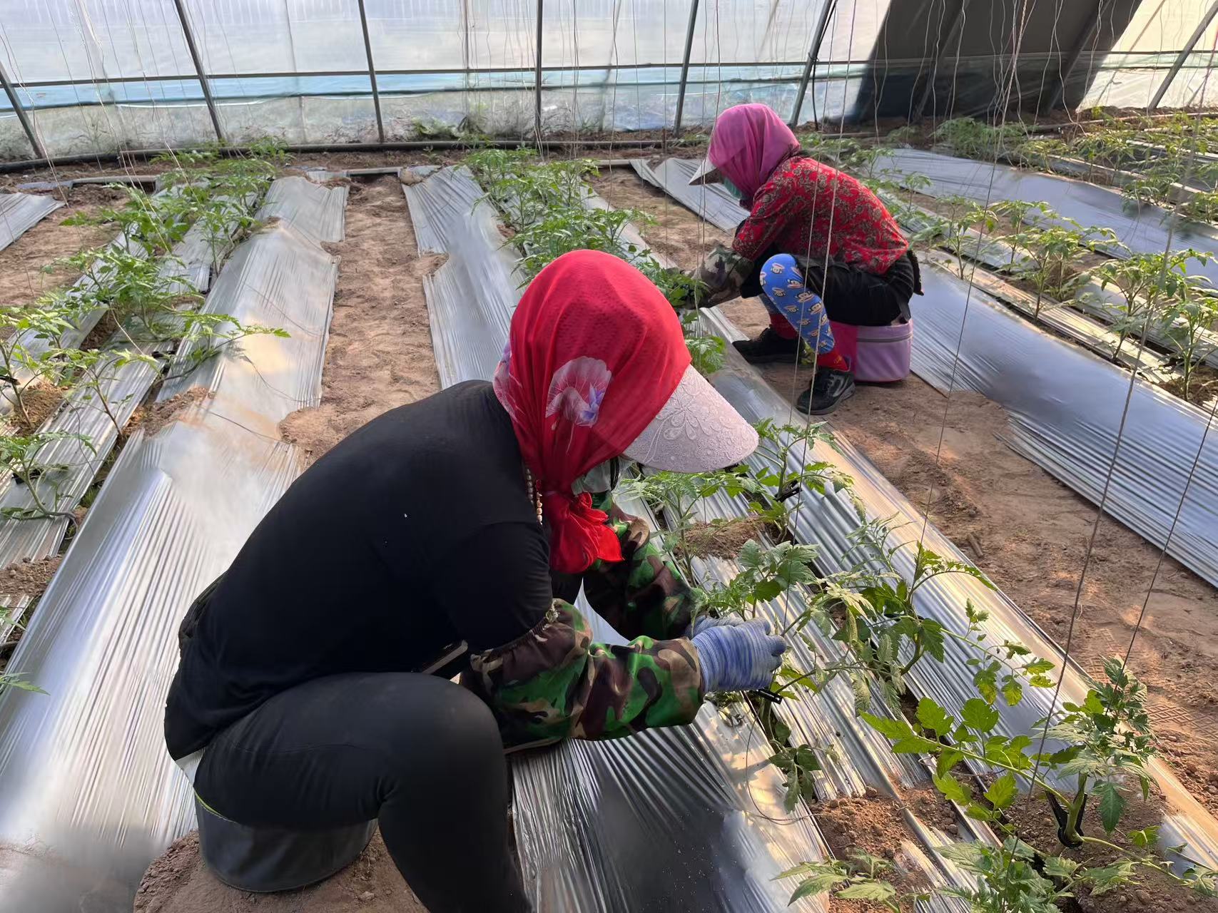 棚内,几名工人正忙碌着管护西红柿幼苗。