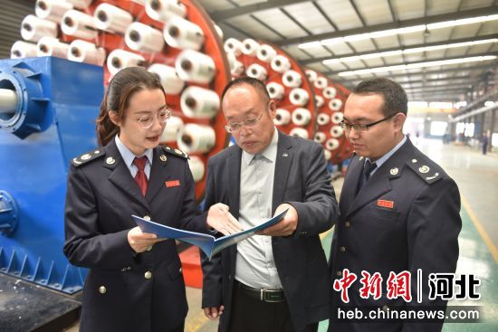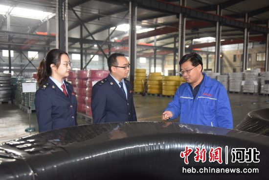 景县一橡塑管生产企业负责人为当地税务部门工作人员介绍自主研发的新产品。高雷 摄