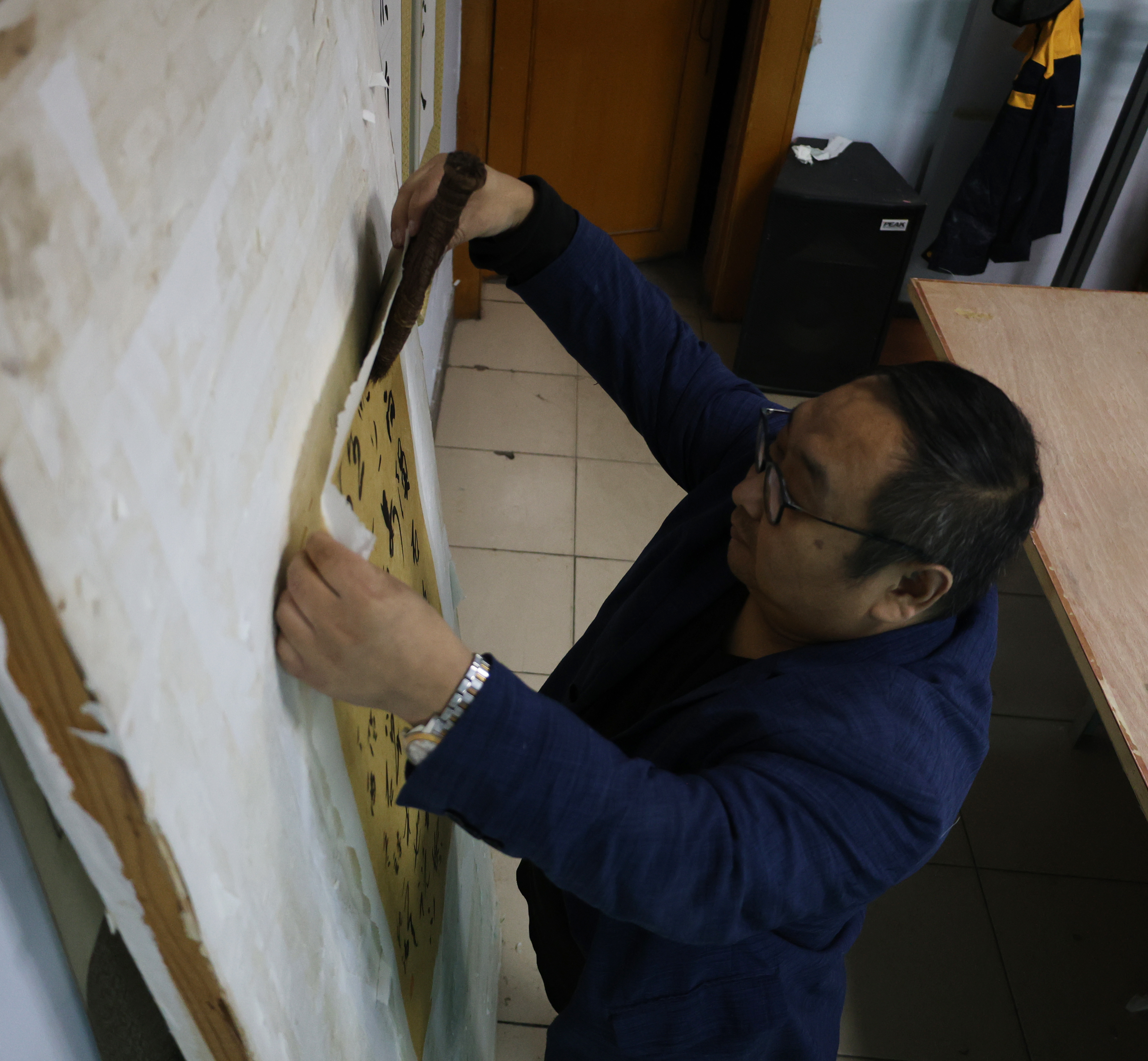 学徒生涯对毫无基础的范志新而言,是充满艰辛与挑战的旅程,但他凭借对书画装裱的热爱和对梦想的执着追求,坚定地一步一个脚印前行。手工装裱有托芯、晾干、下料、镶边、覆背、磨光等几十道工序,装裱一幅作品一般需要一个多月。范志新不断摸索、尝试,沉浸其中,常常会忘记吃饭、睡觉。