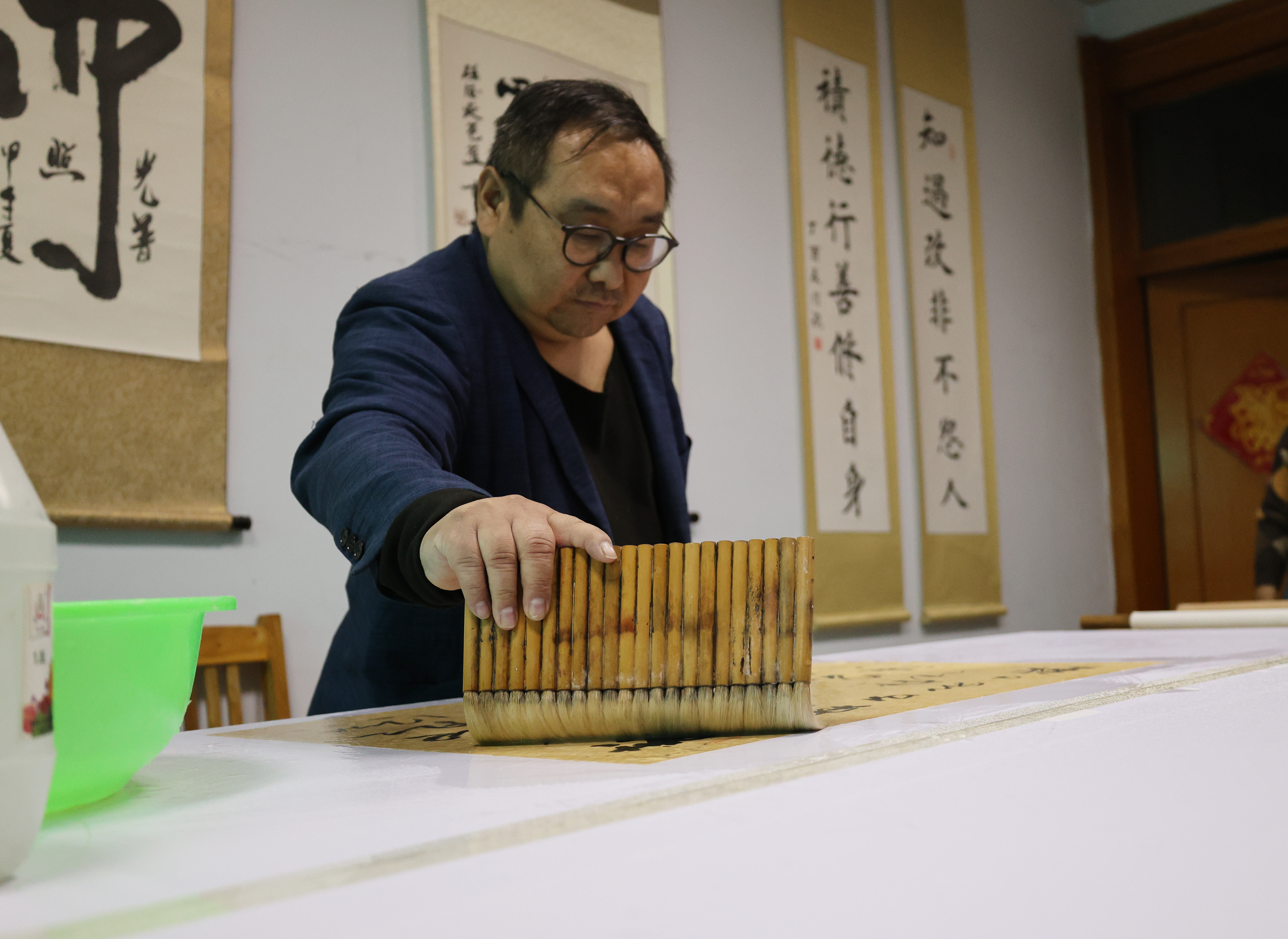 回忆起初学装裱,范志新笑着道:“那个时候,没少‘吃’师父的木尺子。 手工装裱一定要有过硬的技艺。 ”在师父的悉心指导下,他逐渐掌握了装裱的技巧和精髓。
