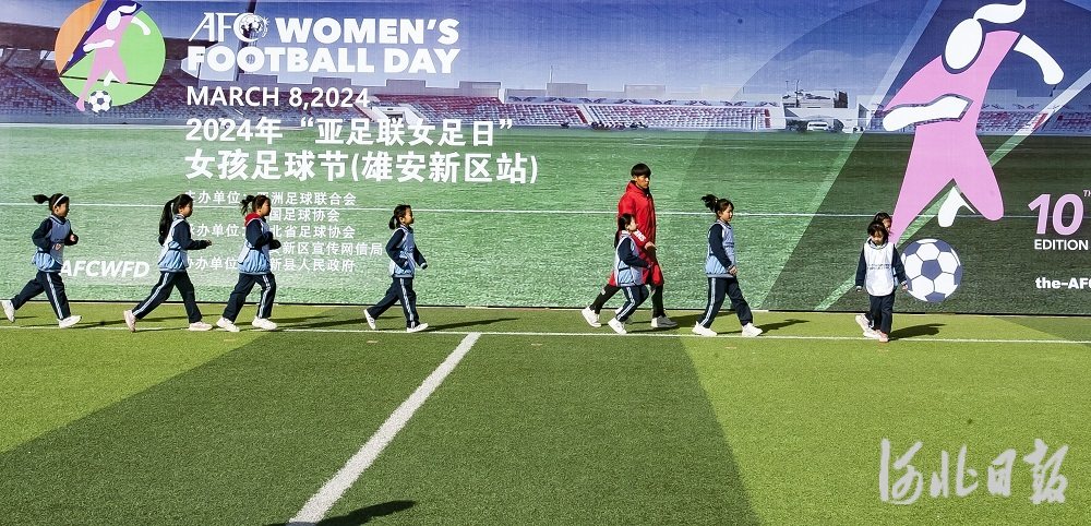 3月8日,2024年“亚足联女足日”女孩足球节(雄安新区站)在雄安足球半岛举行,雄安女孩在各项足球游戏中尽享运动乐趣。河北日报记者刘光昱摄