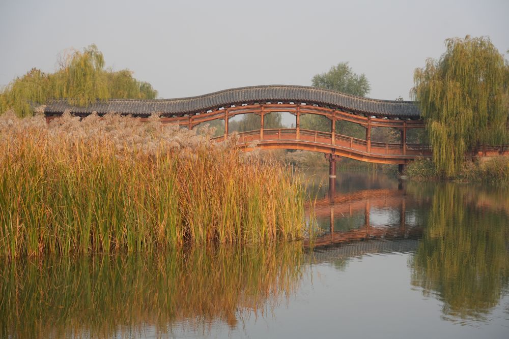 ↑11月7日,雄安新区悦容公园中的芦苇与廊桥。