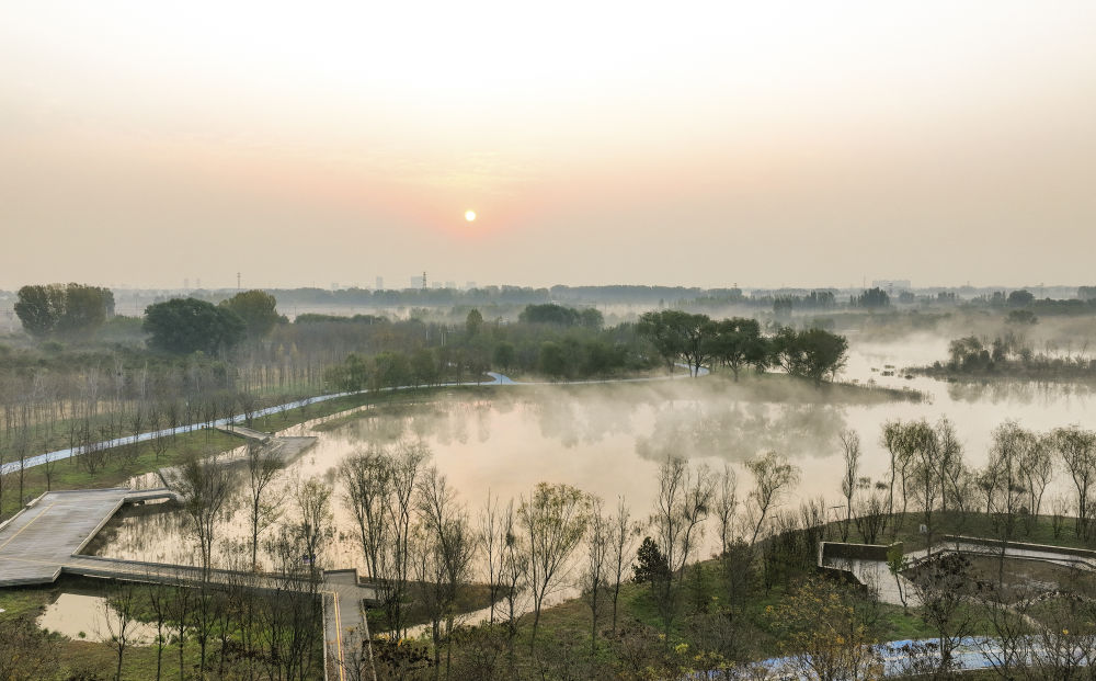 立冬节气,河北雄安新区“千年秀林”黄绿相间,悦容公园芦苇摇曳,风景别样美丽。