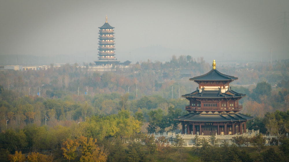 ↑11月7日拍摄的雄安新区悦容公园与雄安商务服务中心(无人机照片)。