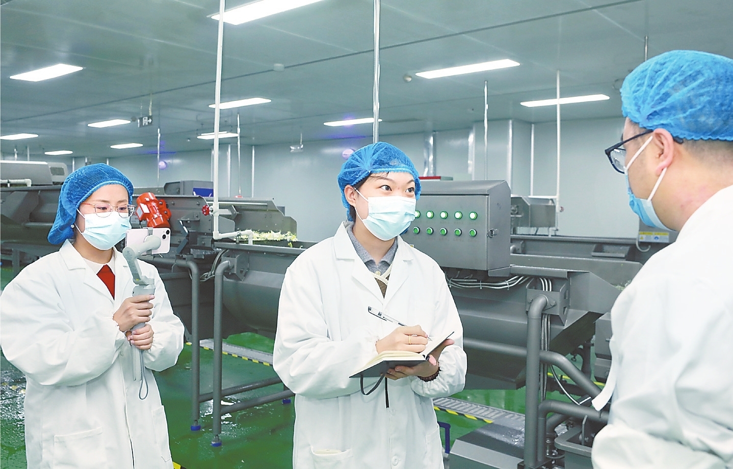 为了更深入、直观的感受“净菜”生产过程,摄影记者陈月振、新媒体记者闫海雪及文字记者崔朋玮换上防护服装,戴上手套、口罩、头发罩,穿过风淋室,经过全方位消毒后,步入净菜生产间。流水线上的土豆丝、芹菜条、白菜段成了摄影记者陈月振镜头中的主角,他对准这些干净鲜亮的产品一顿“狂拍”。新媒体记者闫海雪则将镜头对准了生产线上忙碌的工人,拍摄下一幕幕忙碌而有序的场景与画面。实地采访更让年轻记者崔朋玮对衡水净菜有了更多了解,并引以为傲。