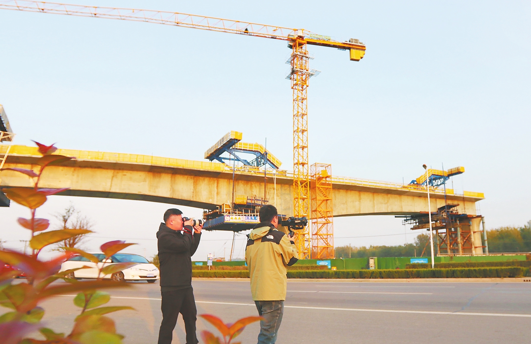 摄影记者拍摄记录雄商高铁建设进展。