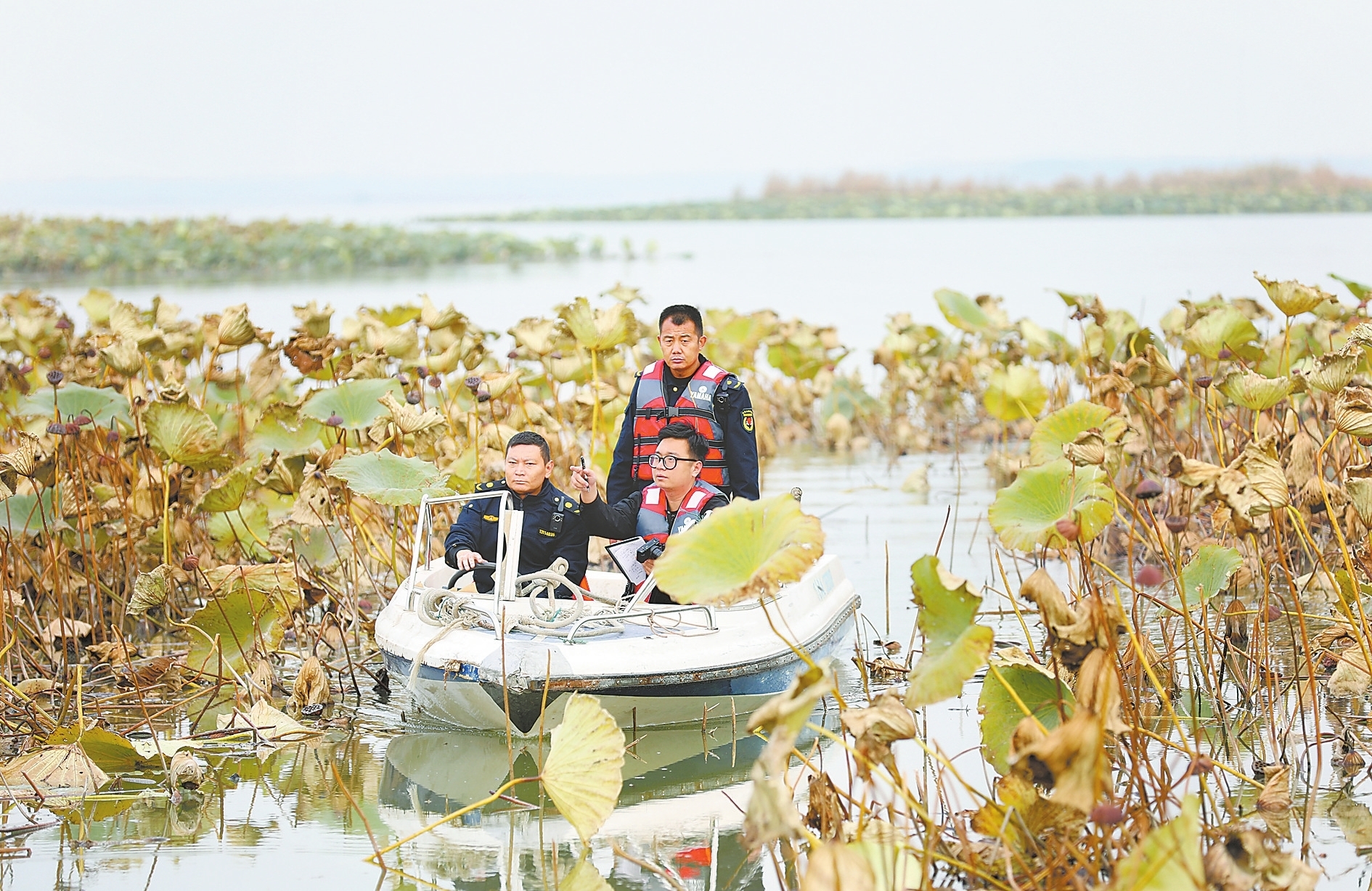 记者乘船在衡水湖采访。