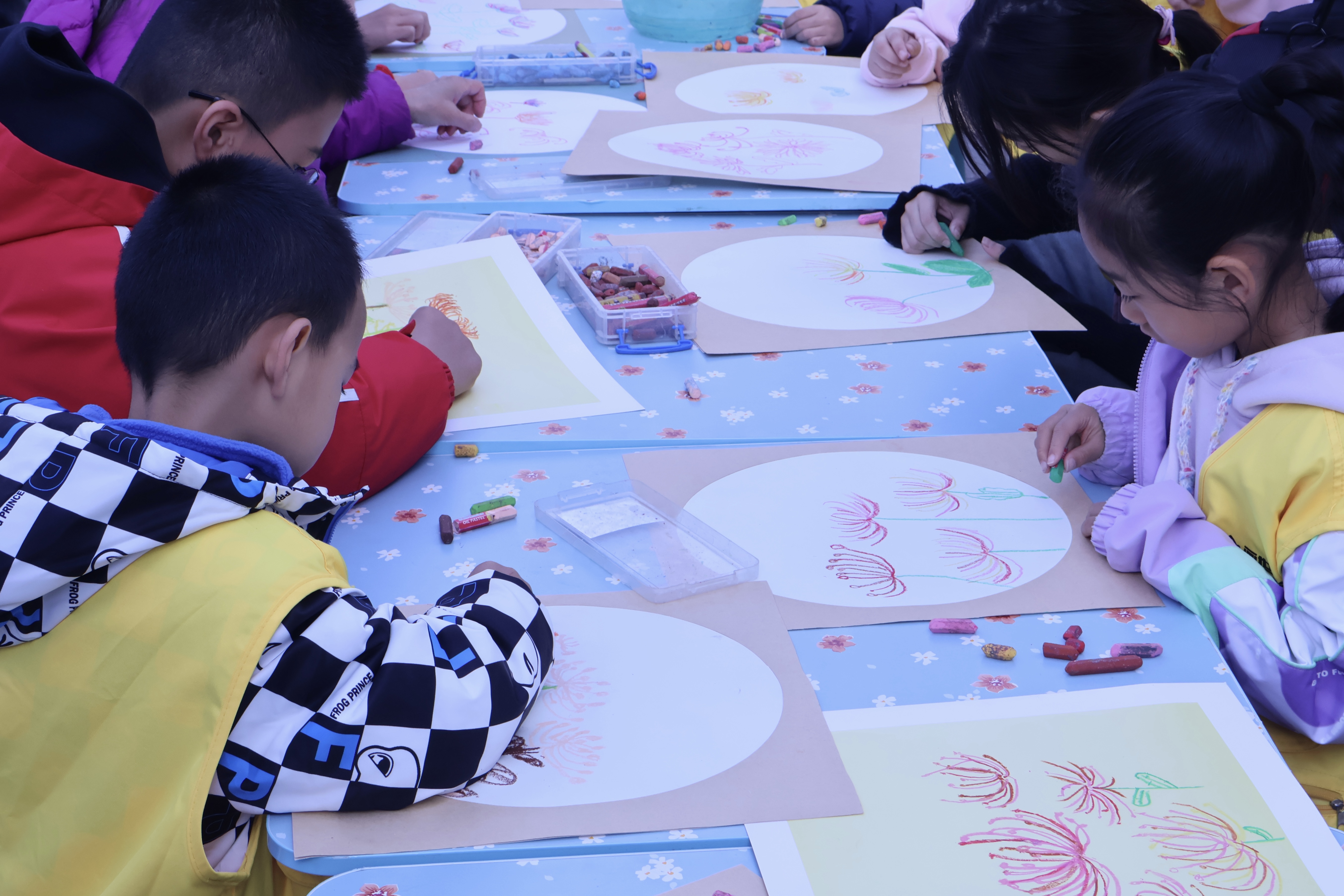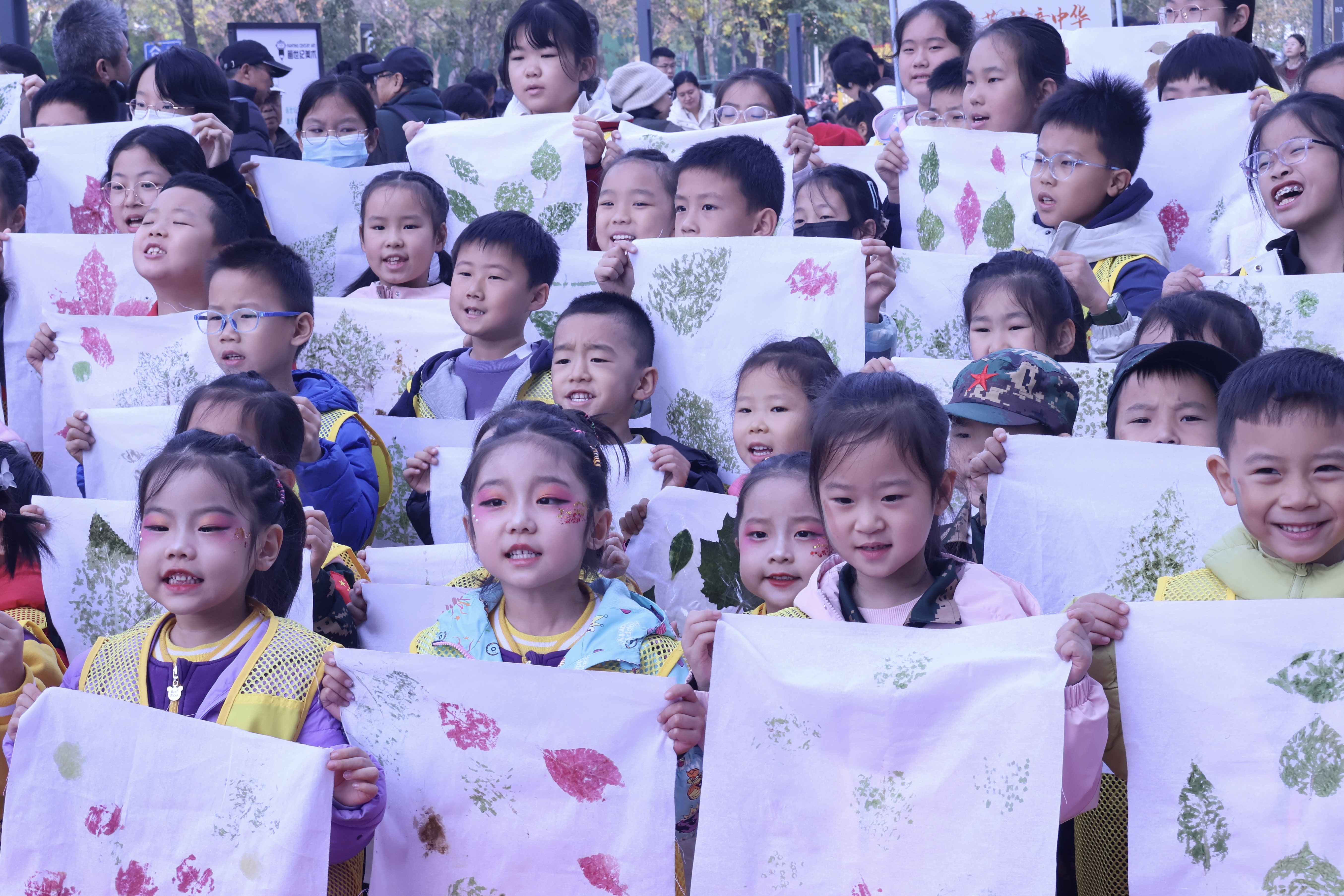 伴随着阵阵菊香,写生区和非遗鲜花拓印体验区热闹非凡。在写生区,工作人员站在菊花旁讲解并演示了写生的技巧,对孩子们的写生进行了细心指导。在非遗鲜花拓印体验区,孩子们两两一组,分别坐在地垫两边,将不同颜色的树叶随心摆放并固定在面前的白布上,通过不断地敲打,将树叶的形状、颜色、纹路、肌理印染在白布上。