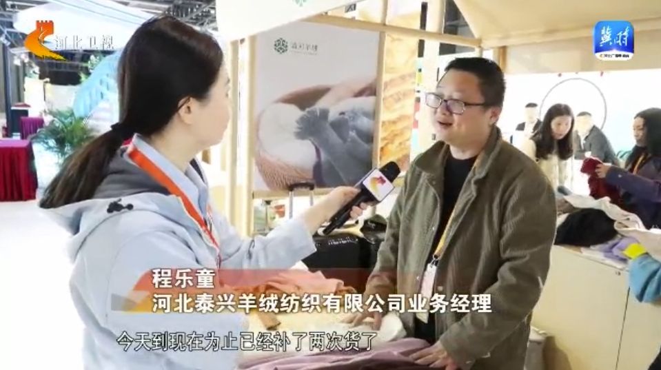 早上一开馆,河北展区里的清河羊绒展位就围满了人,不一会儿,试穿的衣服就堆叠成了小山。