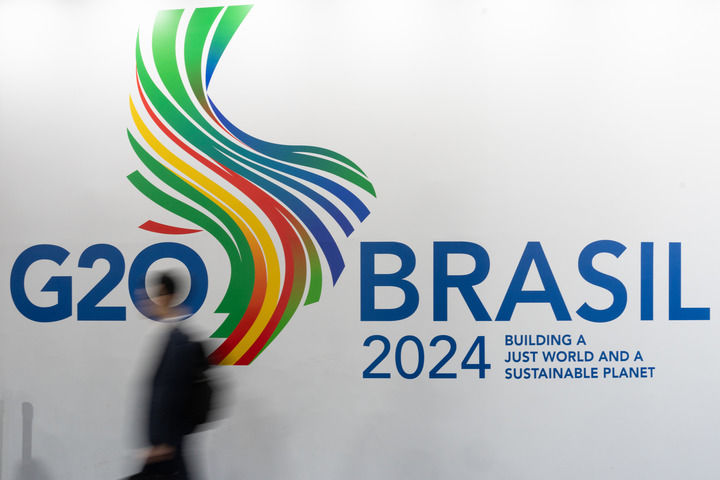 2024年2月21日,在巴西里约热内卢,一名男子经过G20标识。二十国集团外长会议2月21日和22日在巴西里约热内卢举行。新华社记者 王天聪 摄