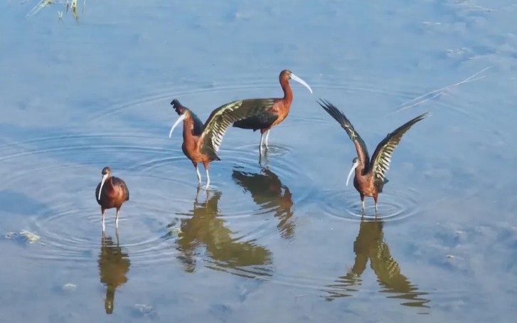 今年5月17日,正在白洋淀唐河汇入口附近进行慢直播的记者,在白洋淀发现并拍摄到6只漂亮的大鸟。经专家确认,这些鸟为国家一级保护野生动物彩鹮。镜头中,这些鸟有的在水面上嬉戏,有的将喙扎进水里觅食,还有的用喙梳理身上的羽毛。