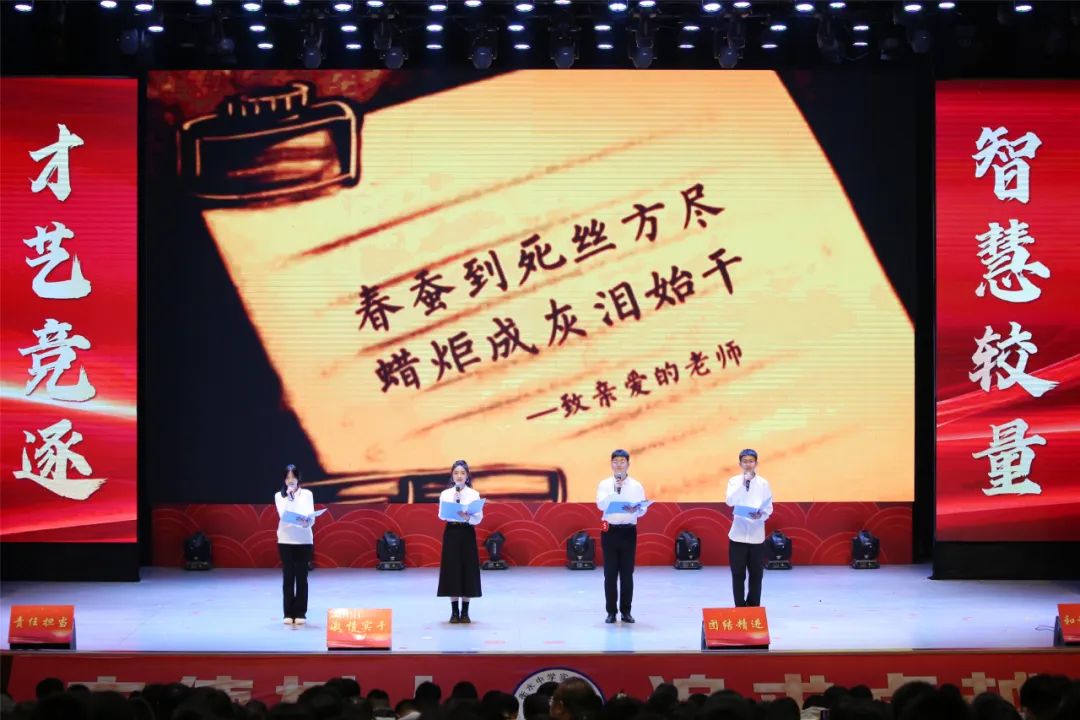 才艺比拼环节更加异彩纷呈,时兆春老师的开场表演不仅展现了自身魅力,更是点燃了现场氛围。王伟光老师和司铭老师带来的太极扇和武术串烧,带领学生走出教室,打开了室外天地,体现出班主任的多才多艺。白梦影老师的talk show 《高三,我与你同在》,让我们感受到了语言的力量。程海峰老师表演的《酒歌》,让人们沉浸在生活的热情与活力中。梁嘉诚、代梓坤老师带来的诗朗诵《师爱无言、落花有声》,体现出班主任对教育事业无限的忠诚。该环节集中展现了衡实班主任的风采,也让同学们见到了班主任才华横溢的一面,现场气氛热烈,掌声、欢呼声不断。