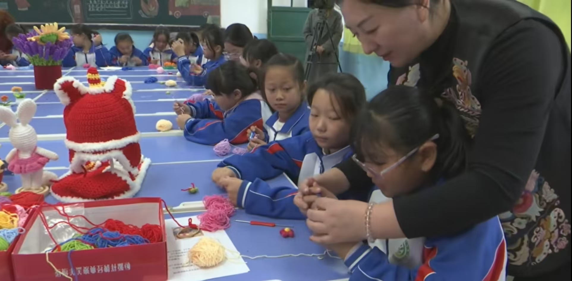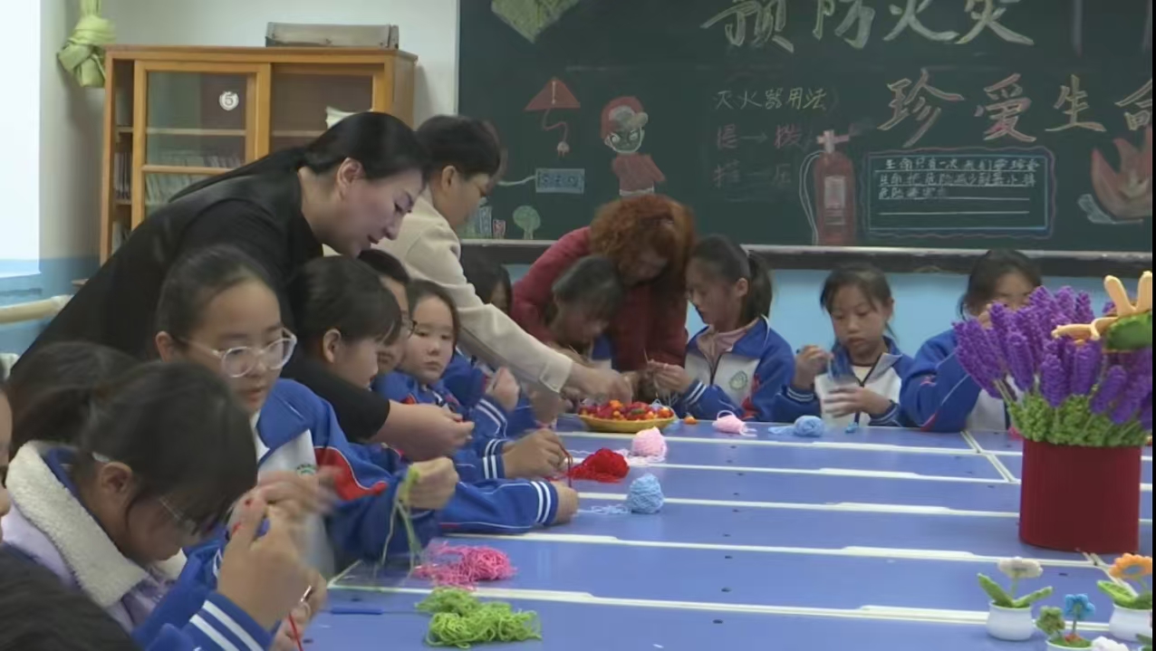 活动现场,一根根色彩斑斓的绒线,在张静红的巧手穿梭下,编织出精美的图案,迅速吸引了学生们的目光。她现场展示了多件精美的绒线编织作品,每一件都蕴含着匠人的巧思与智慧,详细介绍了绒线编织的制作工艺及其背后的文化寓意,将绒线编织的独特魅力展现得淋漓尽致。在老师的指导下,学生们纷纷拿起绒线和编织针积极参与,从复杂的花纹到细腻的针法。原本普通的绒线在他们稚嫩的小手中逐渐有了新的花样。