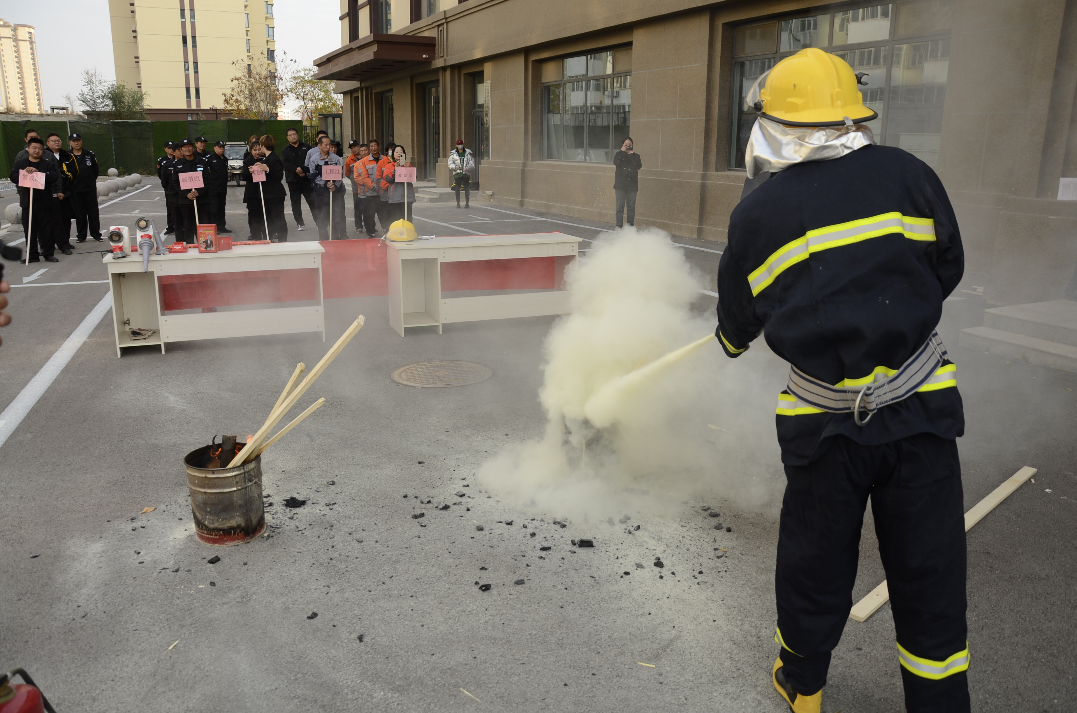 演练开始前,秩序主管结合消防应急预案,向参与人员详细讲解了演练流程和消防安全工作重要性,并现场解读和演练了火灾应急和预防、火场疏散逃生、灭火器使用方法、消防服着装规范、防毒面具使用方法、消防水带连接方法、消防控制器使用操作等消防技能。