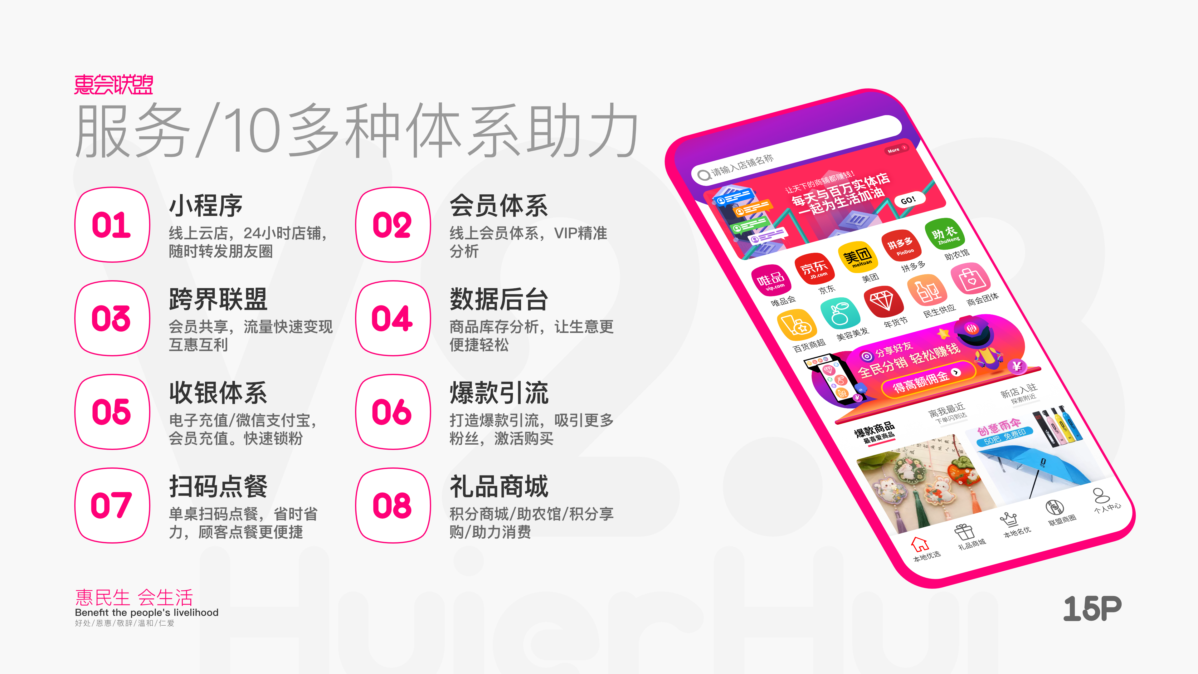 面对实体商家营销宣传难、流量转化难、引流成本高、营销裂变难等问题,惠会联盟平台边实测边改进,围绕支付赋能、营销赋能两大板块,开发出十余项服务体系,精准满足不同商家需求:平台入驻费用每年仅需1000元,支付费率为0.3%,远低于其他大型电商平台,小微商家易于接受;平台开发的聚合支付小程序,一码兼容多种付款方式,收银的同时线上帮商家发券引流,提高用户到店率;通过为商家在平台投放广告、打造爆款产品等方式,将平台公域流量转化为商家私域流量;一键生成宣传海报,通过分销激励引发裂变传播,让更多人帮忙卖货;联盟圈内商家相互转介,通过积分制客源共享,增加彼此门店的客流量和成交量……