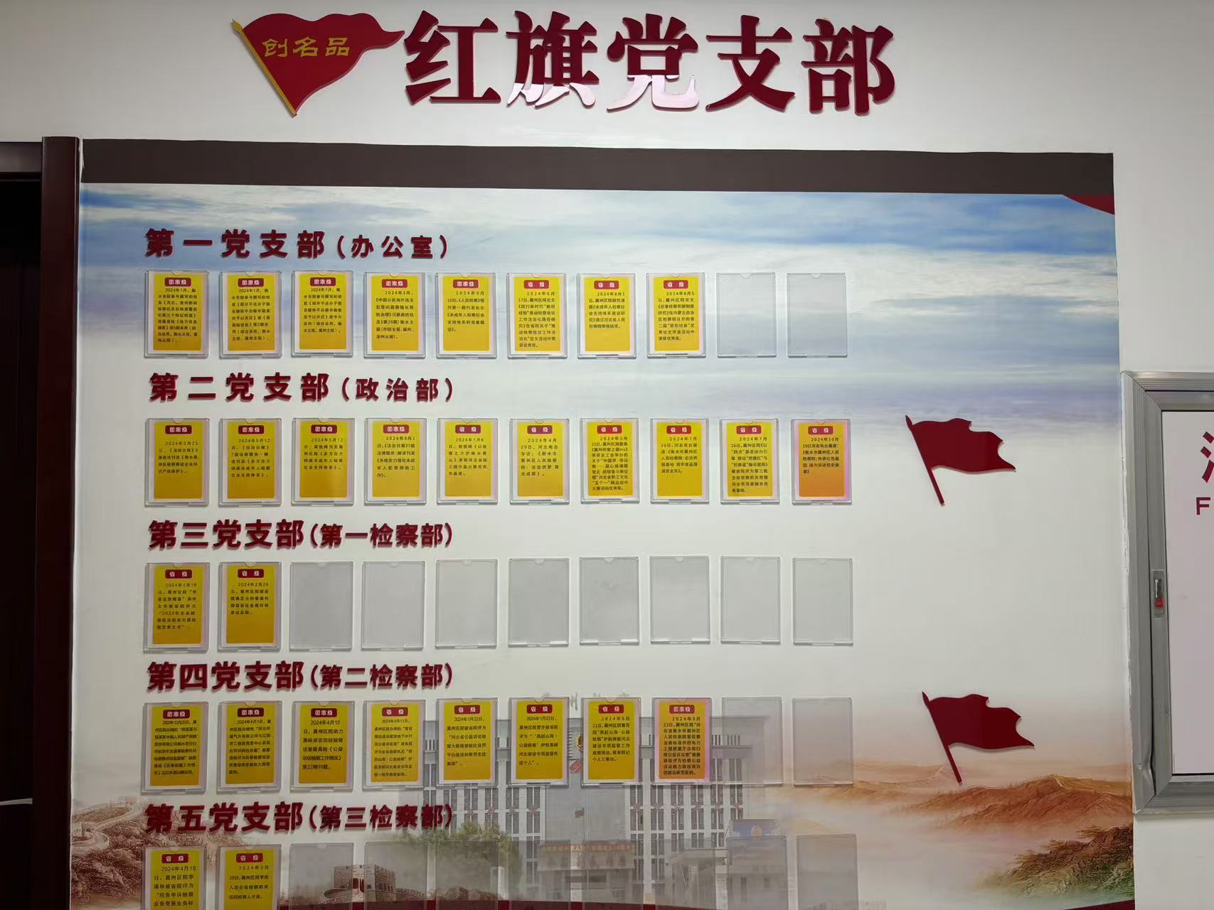 坚持“把党支部建在业务一线”。在5个内设机构设置5个党支部,由主要负责人兼任党支部书记,一体谋划本部门党建和检察业务工作,同步推进思想建设、队伍建设和业务建设。在楼道设置党建文化墙,设立各党支部党建活动展示栏,每周更新主题活动、工作成绩、创新创优等内容,通过横向对比,营造全员夺旗争先、拼搏进取的向好风气。