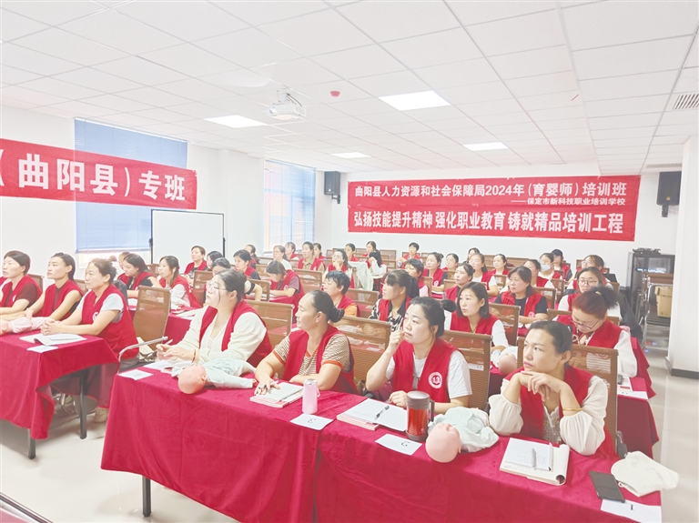 在竞秀区数智·人力资源服务产业园里,正在进行一场育婴员免费技能培训,30多位学员们在讲师的指导下进行按摩、清洗等训练,姜颖学得格外认真。她说,这是她今年第3次参加技能培训班了。