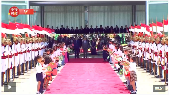 当地时间11月20日,在巴西总统卢拉为习近平主席举行的欢迎仪式现场,巴西歌手用中文演唱中国经典民歌《我的祖国》,这是欢迎仪式的一项特别设计。