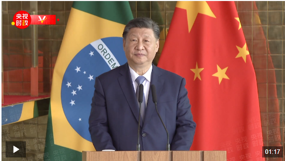 习近平指出,这是我时隔5年再次踏上这片“充满爱和希望的土地”。启程前夕,我收到多封巴西各界友好人士的来信,信中洋溢着巴西人民对中巴友谊的珍视和对深化两国友好的期盼,令我深受感动。刚才,我同卢拉总统举行了亲切友好、富有成果的会谈。我们共同回顾中巴关系50年发展历程,一致认为两国关系正处于历史最好时期,日益彰显全球性、战略性、长远性影响,成为发展中大国携手共进、团结合作的典范。