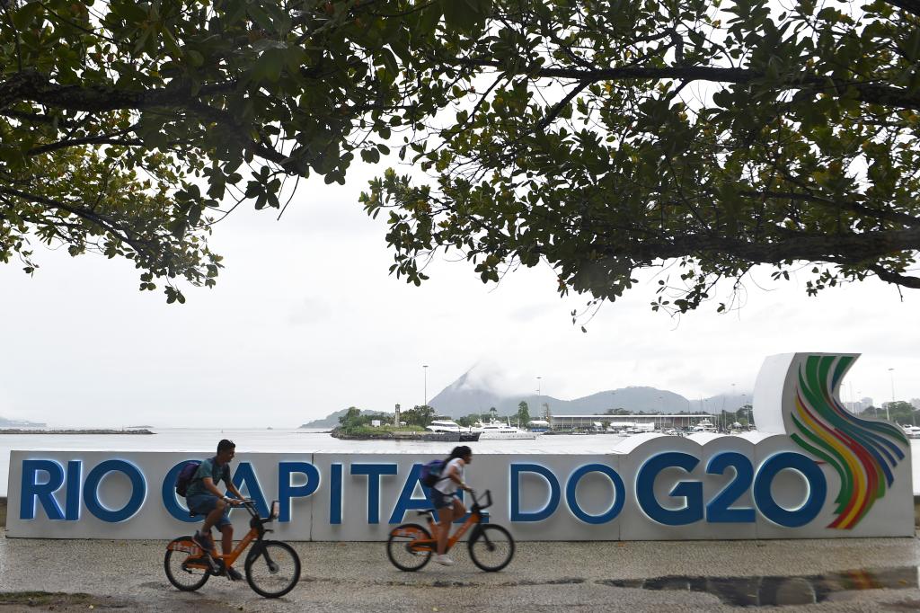 11月16日,在巴西里约热内卢,人们骑车经过二十国集团领导人峰会举办地附近的峰会标识。新华社发(卢西奥·塔沃拉摄)
