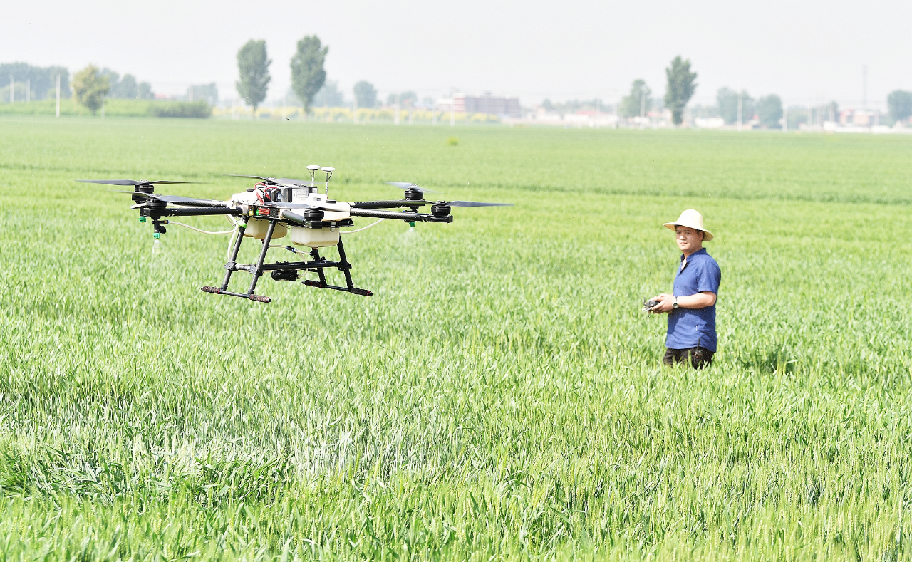 在明月店镇赵家洼村高标准农田里,植保无人机正在进行喷洒作业。(资料图)白永民摄