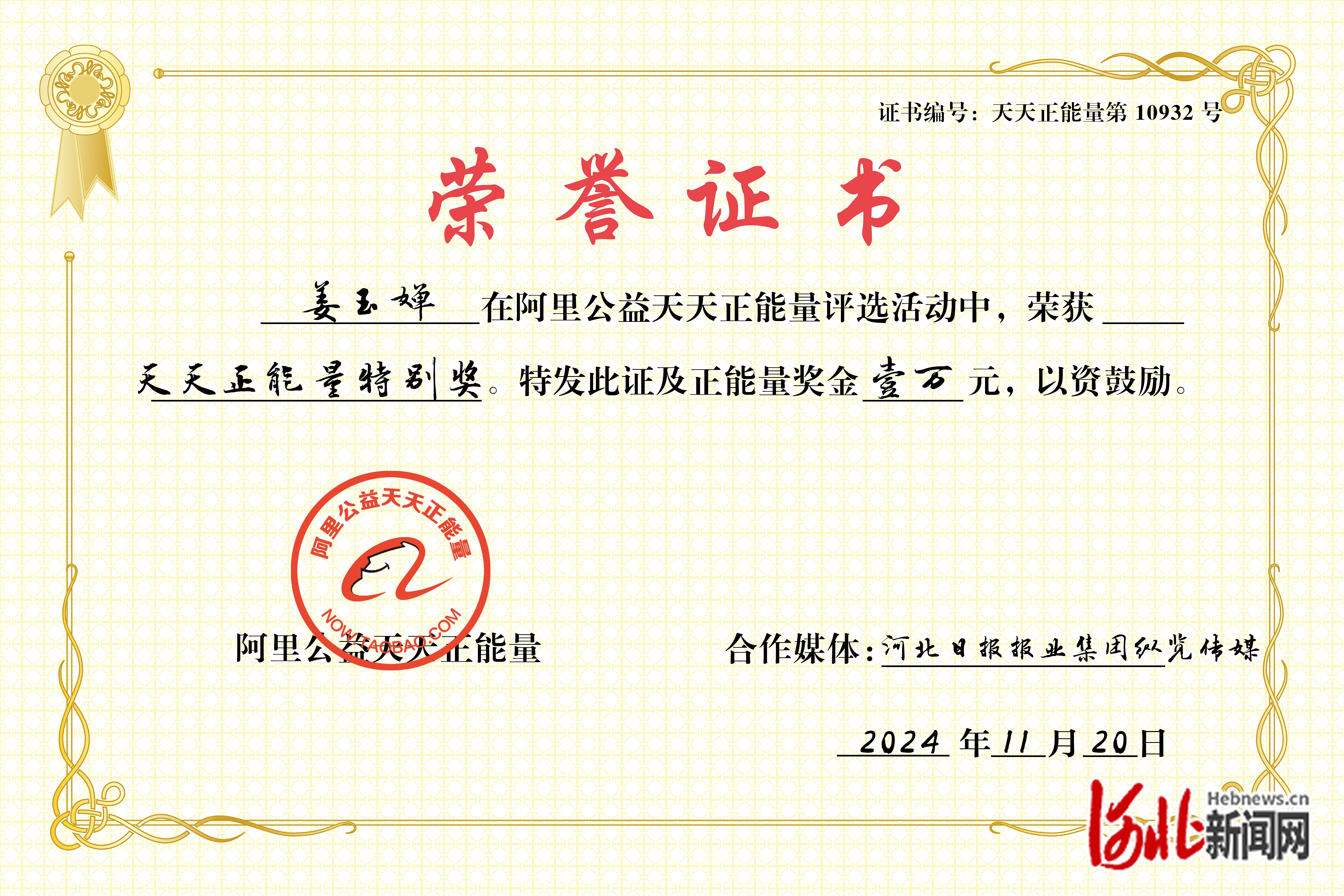 11月20日,阿里公益天天正能量联合河北日报报业集团纵览传媒,为姜玉婵颁发万元正能量特别奖,致敬知识的光芒,致敬行动着的公益力量。