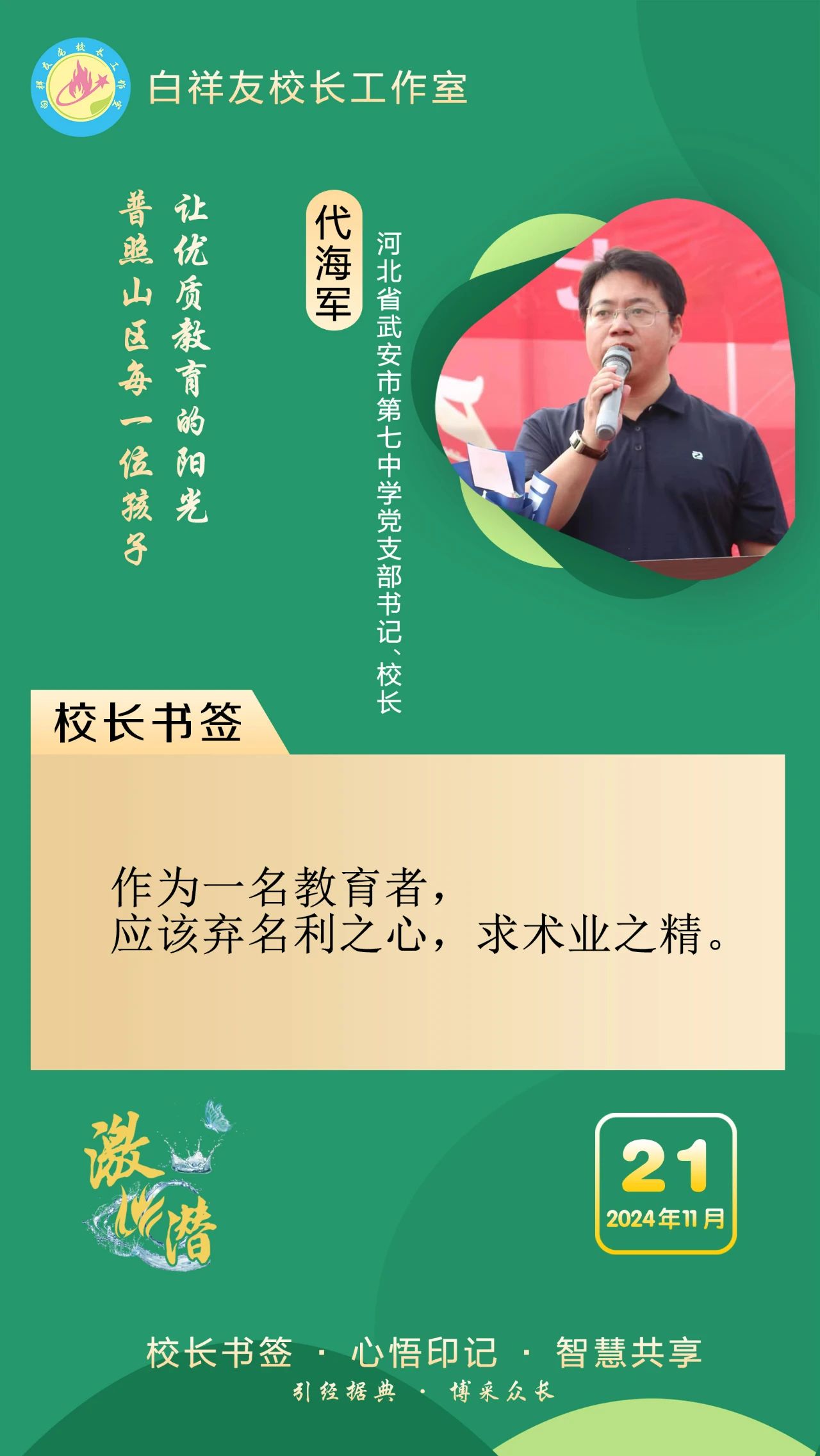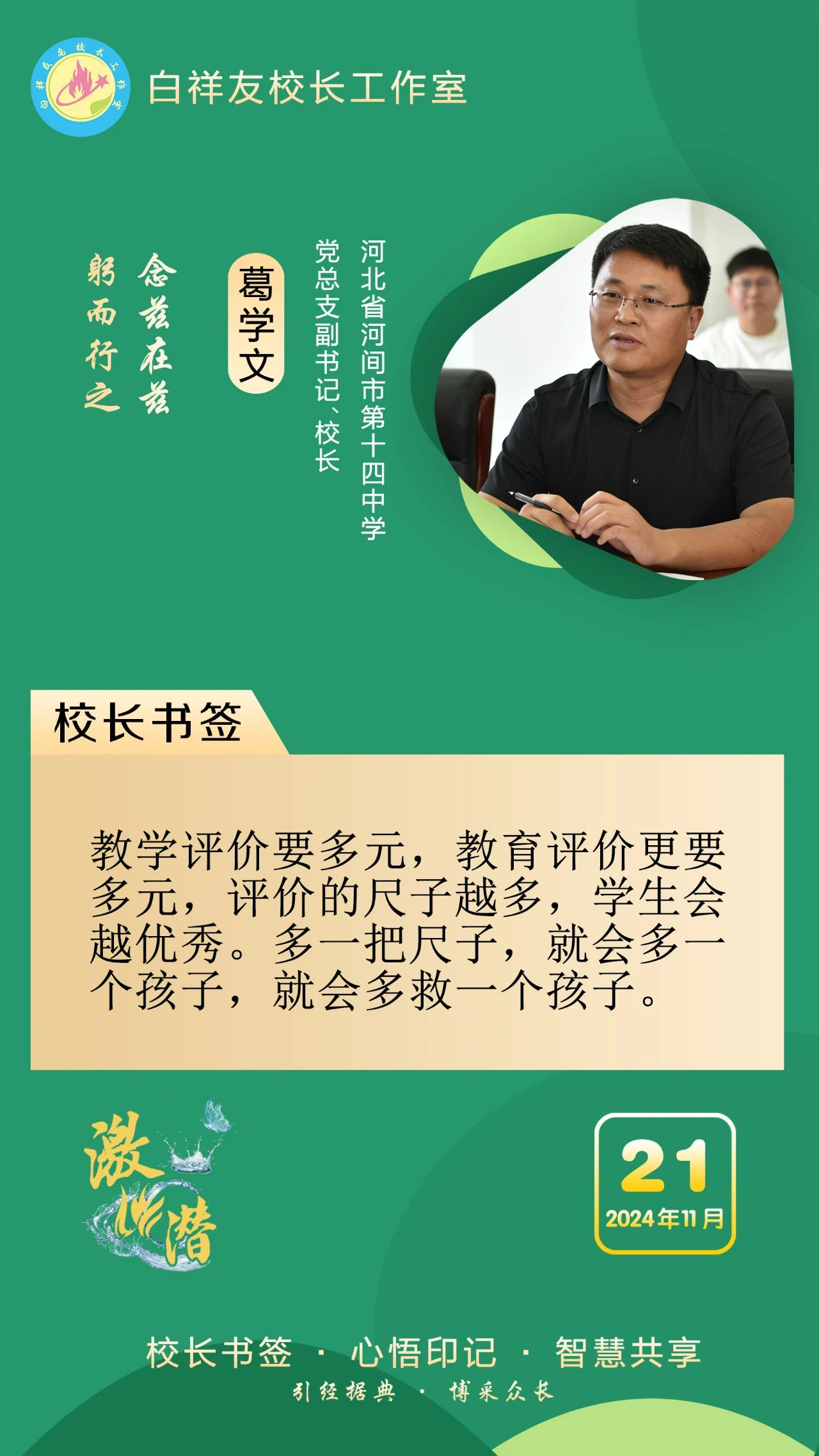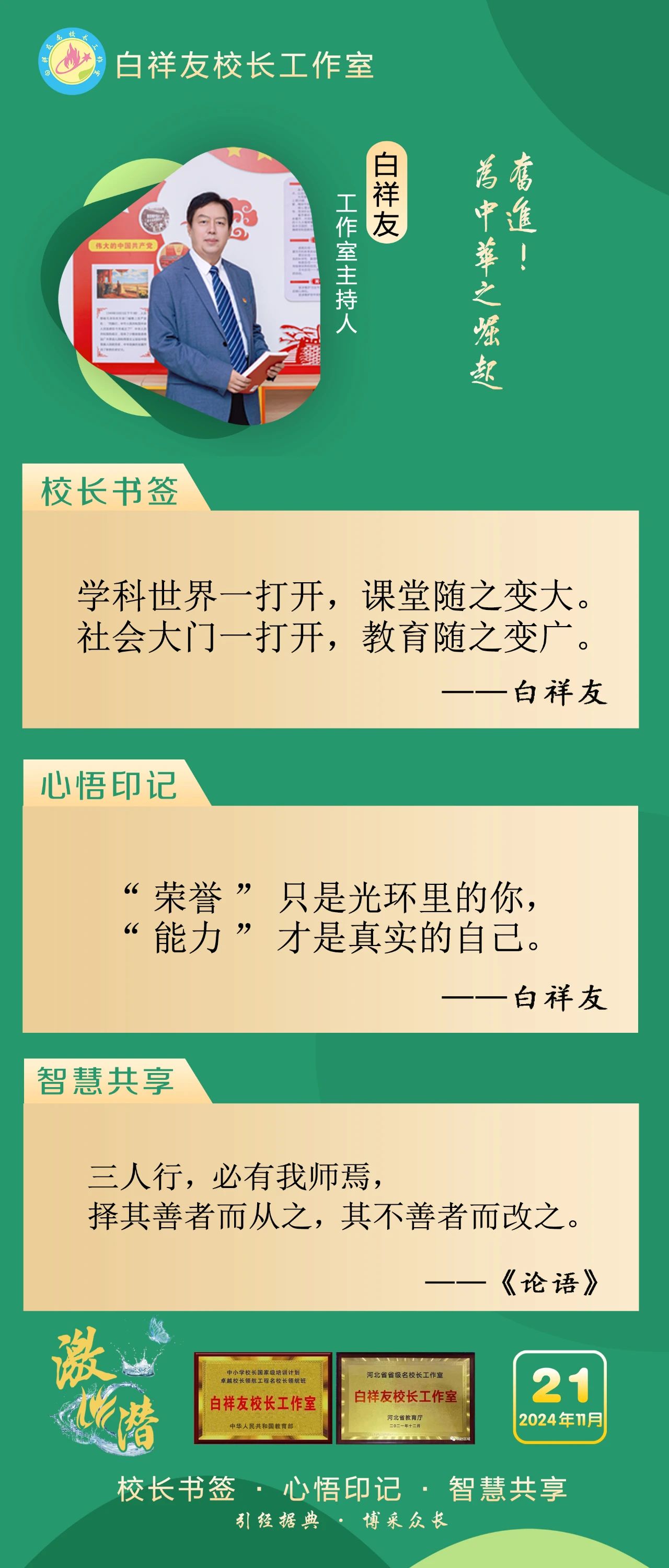 “白祥友校长工作室”成立于2019年4月,是教育部“国培计划”中小学名校长领航工程、河北省首批名校长工作室,目前省内外成员校48个。工作室坚持“资源共享、智慧共融、互助共赢”理念,已成为思想碰撞的交流场,资源共享的品牌站,成果展示的辐射源。