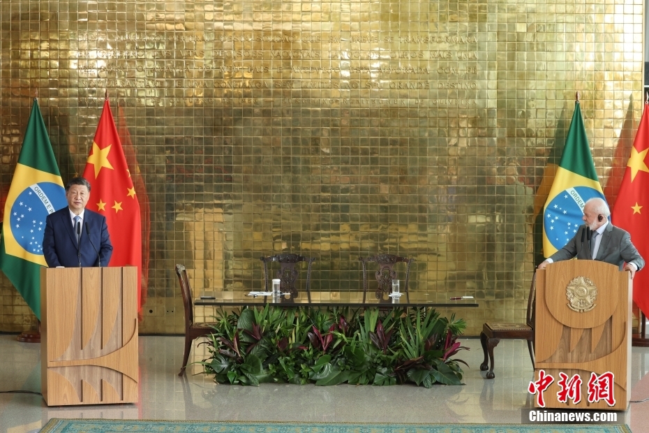 当地时间11月20日,中国国家主席习近平在巴西利亚总统官邸同巴西总统卢拉举行会谈。会谈后,两国元首共同会见记者。中新社记者 盛佳鹏 摄