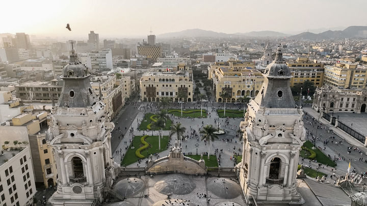 这是10月13日拍摄的秘鲁首都利马武器广场(无人机照片)。新华社记者 李木子 摄