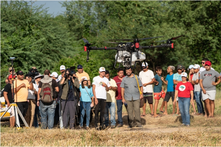 2024年2月2日,在巴西阿波迪,人们观看一款中国生产的农用无人机。当日,中巴农业机械化合作示范项目启动仪式在巴西阿波迪举行,第一批来自中国7家农机企业共31台(件)设备正式交付给巴西农村劳动者组织。新华社记者 王天聪 摄