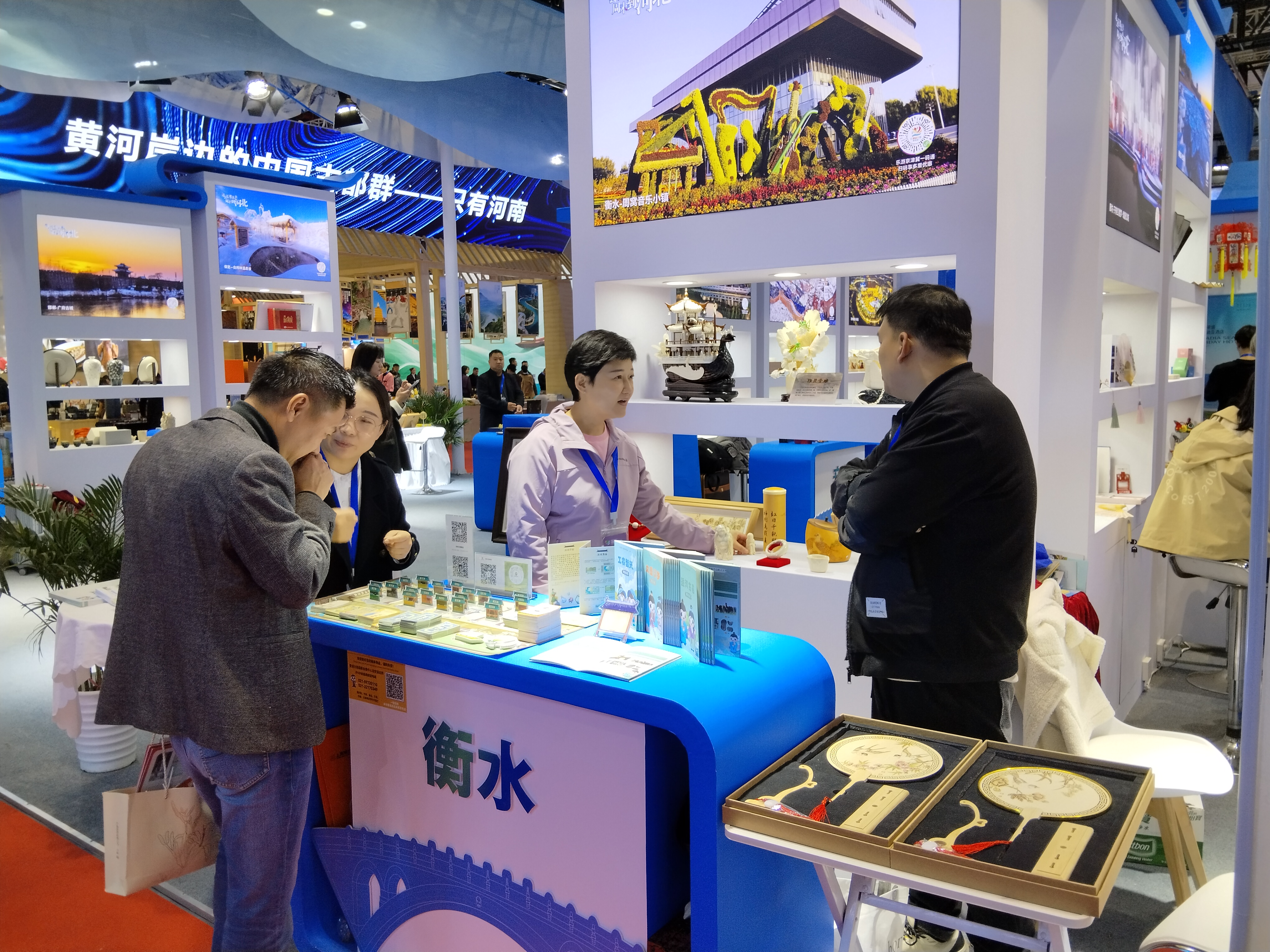 错金银鼻烟壶、竹臂搁烫画、“林深见鹿”茶叶罐、猛犸牙文房套装、董学懂你系列文创、大运河商贸主题桌游……在河北展区衡水展台上,独具衡水特色的产品引起了大家浓厚的兴趣,尤其是故投文旅集团推出的研学旅游课程,咨询人数众多,不少旅行商主动添加联系方式,期待进一步深化交流合作。