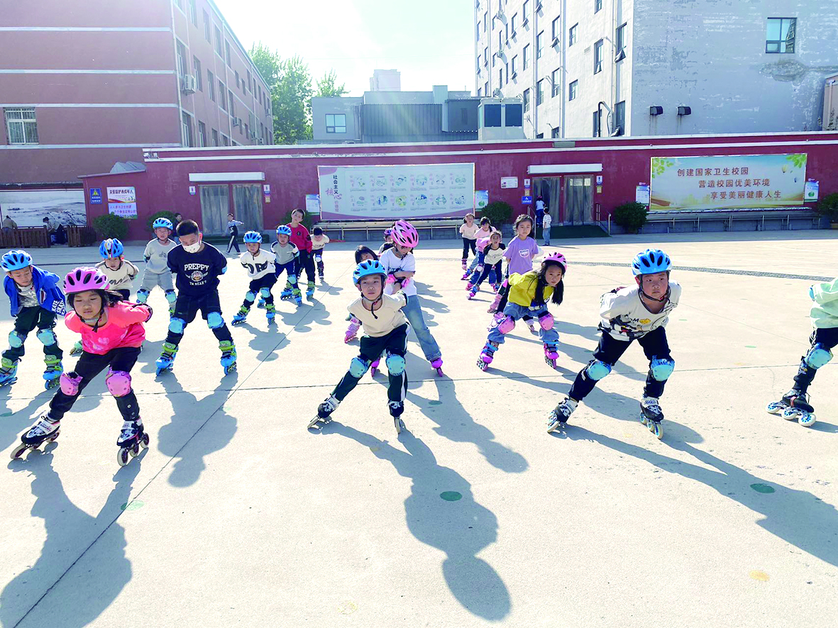在市利民路小学的操场上,一排排学生穿着轮滑鞋在桩间穿来穿去,游刃有余,搭配上传统汉服,更显得英姿飒爽。