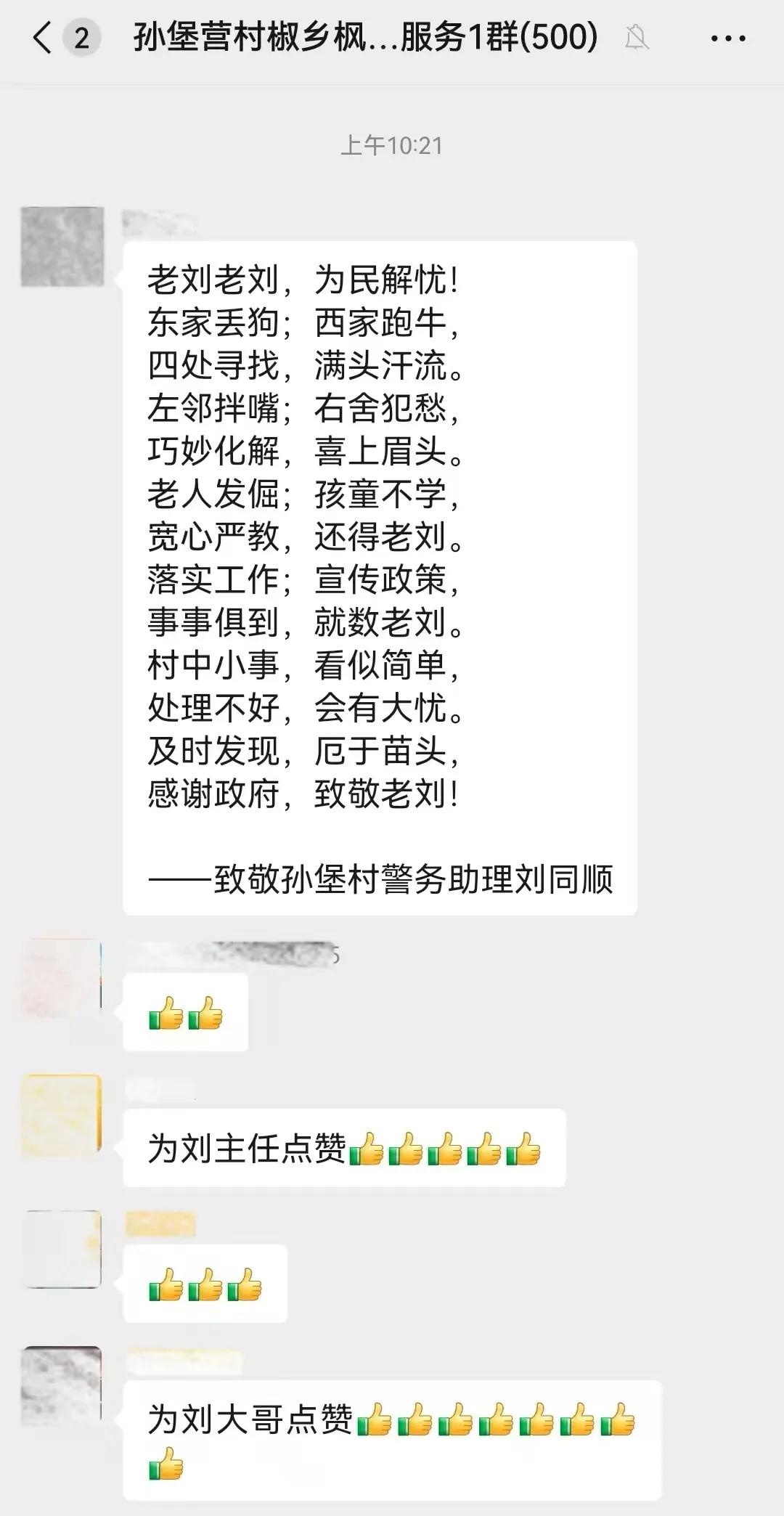 在曹庄镇孙堡营村,一提起60岁的警务助理刘同顺,人们都戏称他“事儿长”,谁家少只鸡丢条狗都找他。小两口儿闹矛盾,女方回了娘家,“叫媳妇”这活儿还就得刘同顺能摆得平。这几年经他劝解和好如初的足有十几对。“咱农村都是家长里短的小事,群众找到咱,咱得当回事,处理清了感觉身上轻巧。”谈起做警务助理的心得,刘同顺说。“老刘老刘,为民解忧!东家丢狗,西家跑牛,四处寻找,满头汗流。左邻拌嘴,右舍犯愁,巧妙化解,喜上眉头……”这首村民给他编的顺口溜儿,是对他工作的认可。