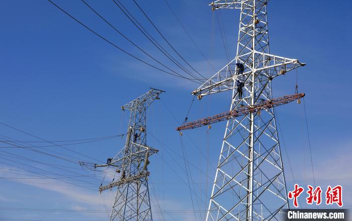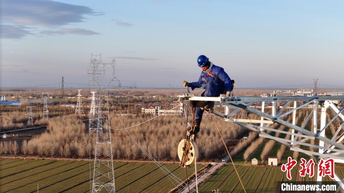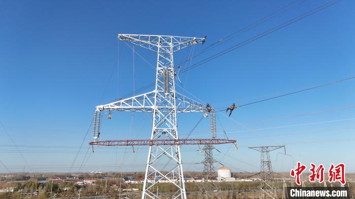图为11月27日,国网衡水供电公司工人正在进行跨越架线作业。 陈康 摄