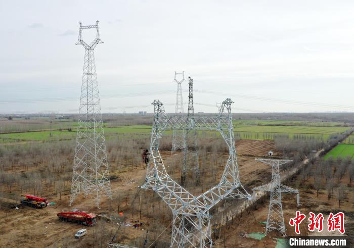 图为11月29日,雄商高铁衡水南牵引站220千伏外部供电工程首次跨越施工完成。(无人机照片) 陈康 摄