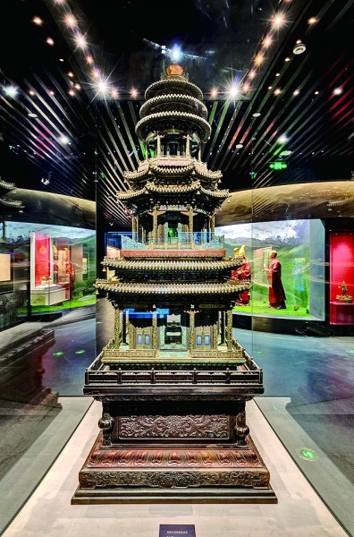 “这座珍贵的万寿塔,见证了一段乾隆皇帝和六世班禅共同维护国家统一、民族团结的佳话,是我们的镇馆之宝。”孙继新介绍,这座塔通高3.5米,重1吨多,由一千四百多个大小部件插接而成,塔身自下至上分为三层,第一层正面刻铭文“大清乾隆乙酉年敬造”。