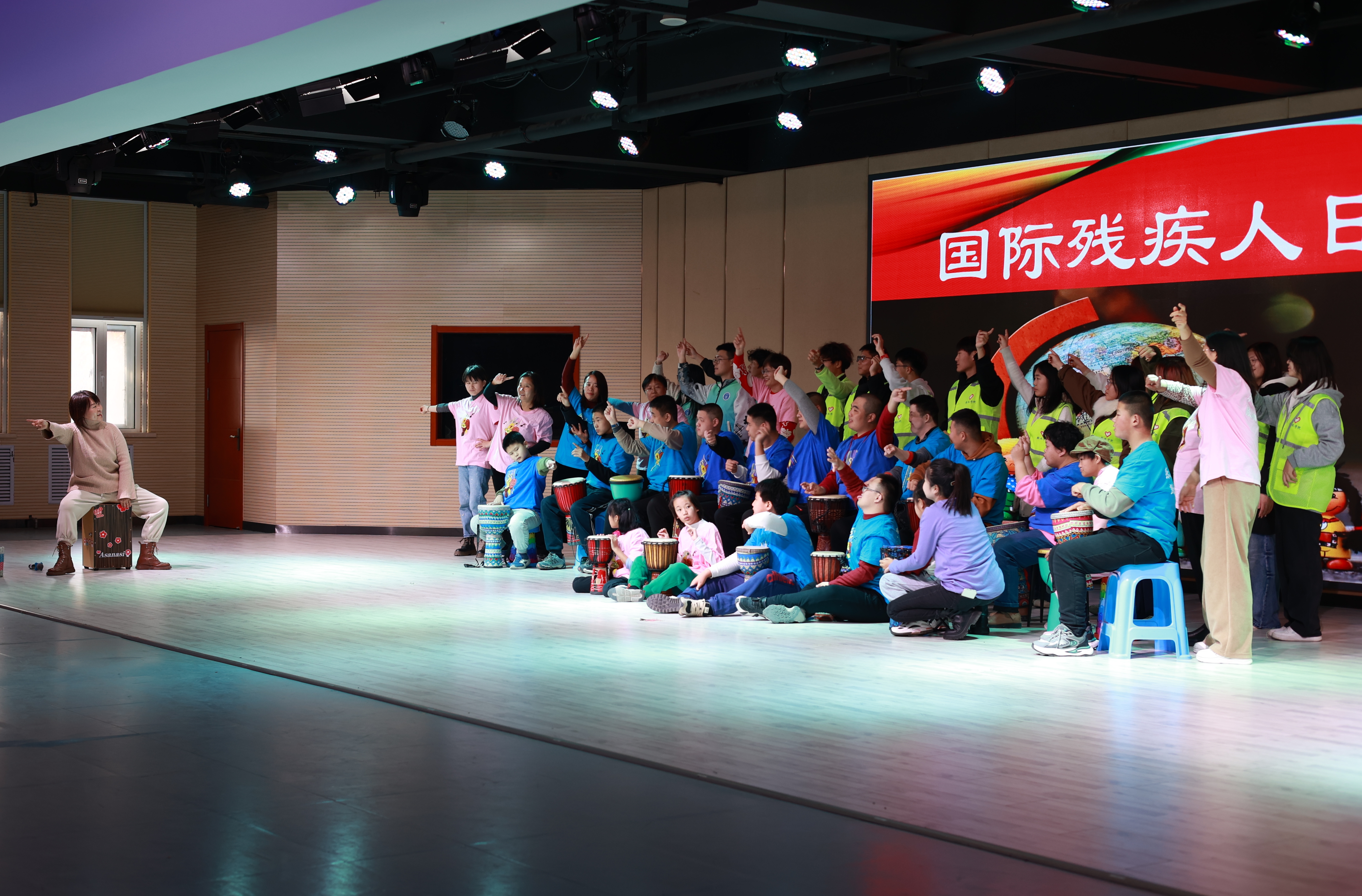 互动表演环节,大学生志愿者引领“心伙伴”们敲响热情的非洲鼓。“咚,咚,咚”,鼓点由志愿者率先发起,“心伙伴”们随之奋力拍动手中的鼓,他们脸上绽放的笑容如阳光般灿烂。在志愿者耐心引导下,双方动作渐趋同步,欢快的节奏仿佛是他们对美好生活共同的欢呼,将活动氛围推向高潮。
