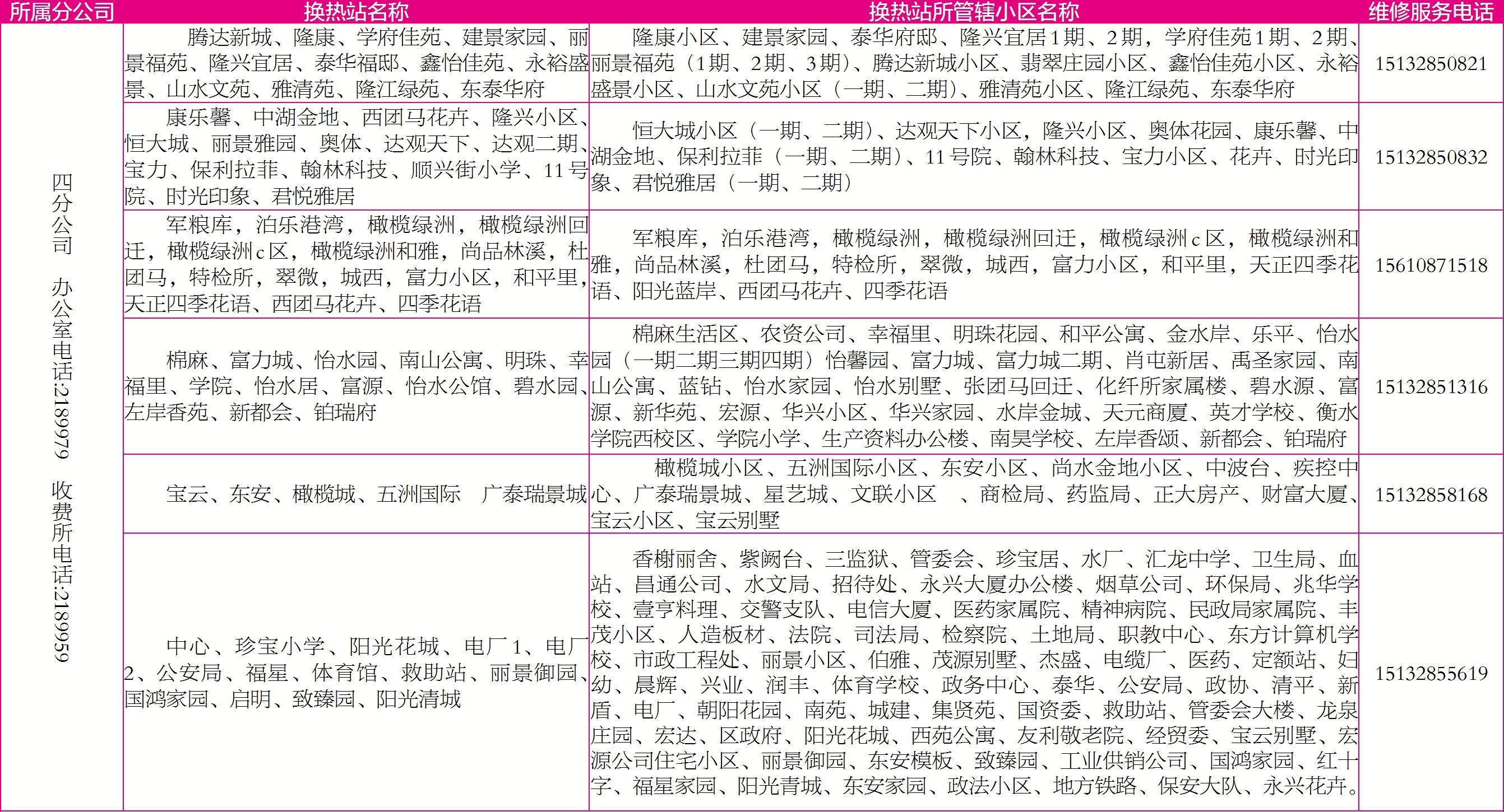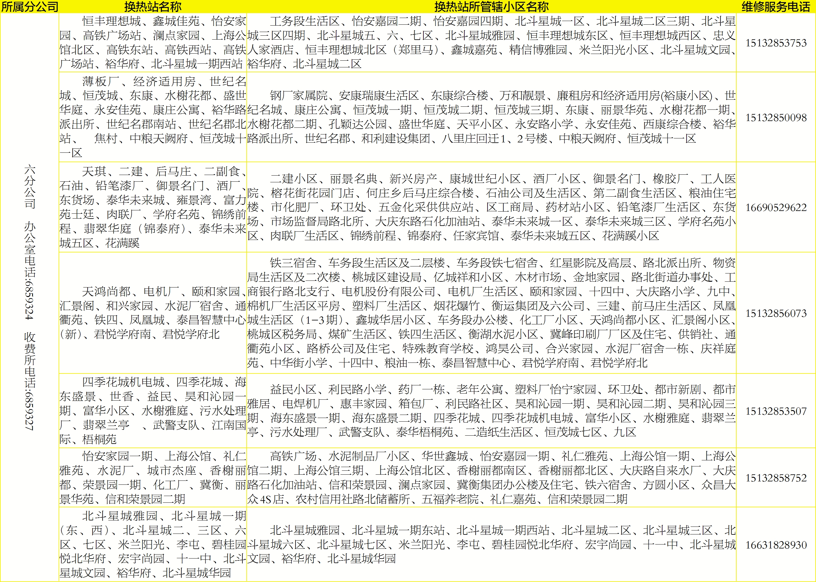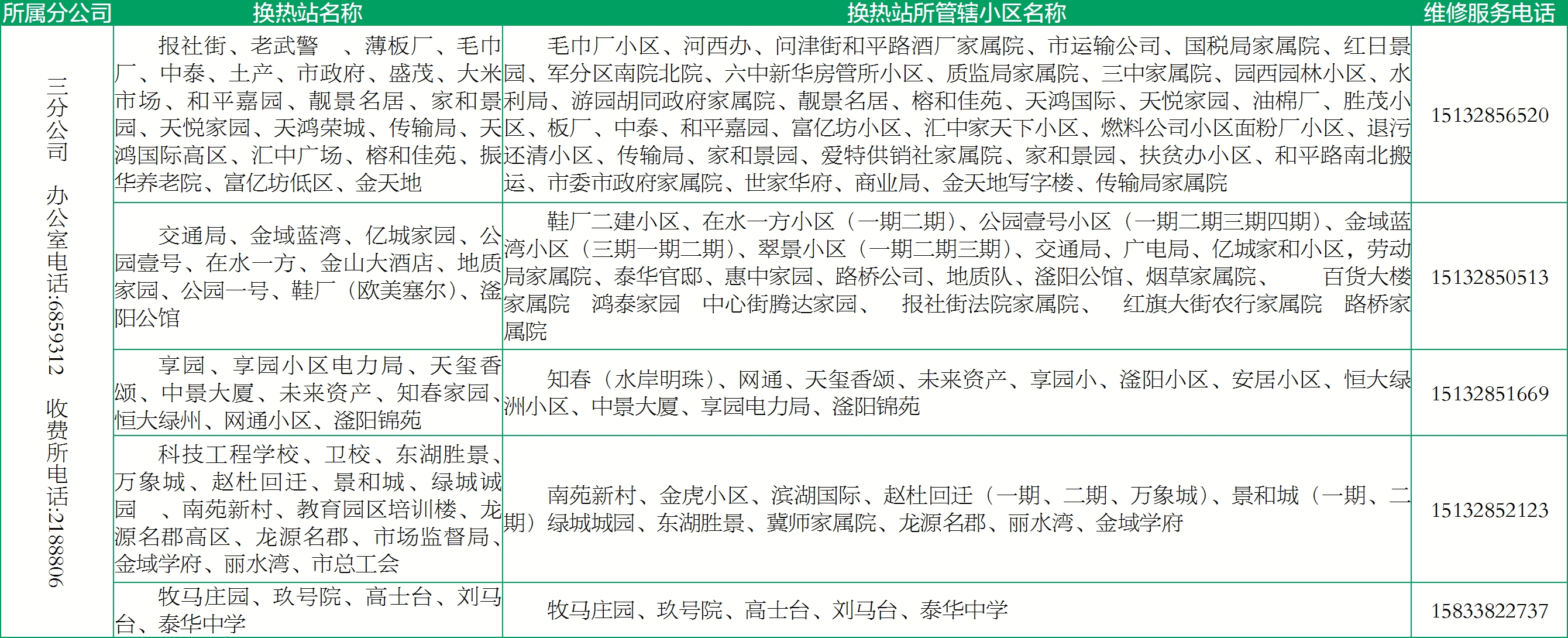 具体服务区域及电话公布如下: