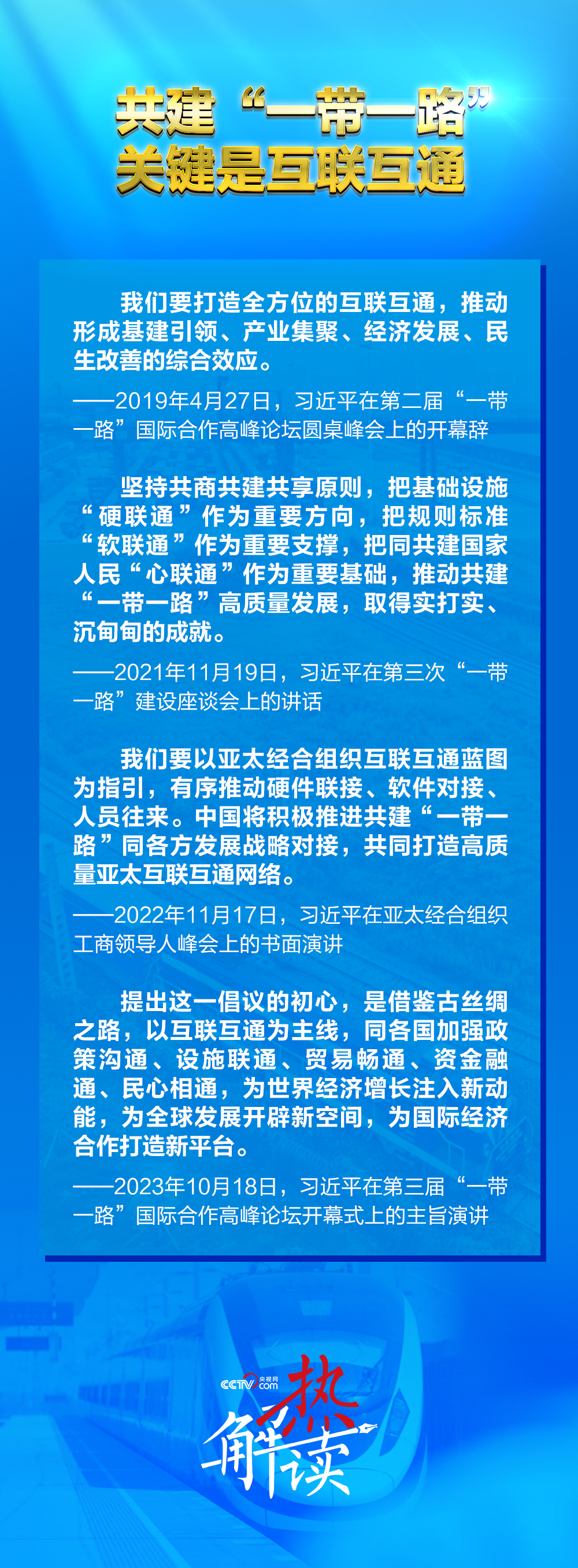 “统筹深化基础设施‘硬联通’、规则标准‘软联通’和同共建国家人民‘心联通’”,“完善‘硬联通’、‘软联通’、‘心联通’协调推进机制”。12月2日,习近平总书记在第四次“一带一路”建设工作座谈会上对深化三个“联通”再作部署。