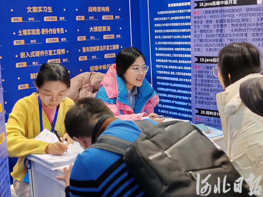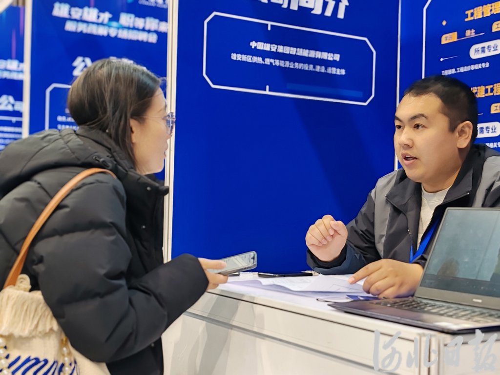 招聘会上,雄安新区党群工作部工作人员向毕业生宣讲了雄安的建设发展、产业布局、人才政策等。来自北京化工大学的硕士毕业生邵建亮一边听讲,一边认真记录。“听完宣讲,我对雄安更加向往了。”他说,自己学的是化学与人工智能交叉学科,得知雄安人工智能产业蓬勃发展后,内心颇感振奋,感觉雄安是一片能够成就梦想的广阔天地。